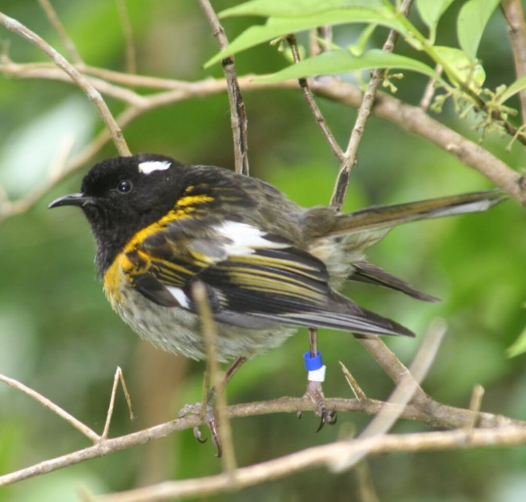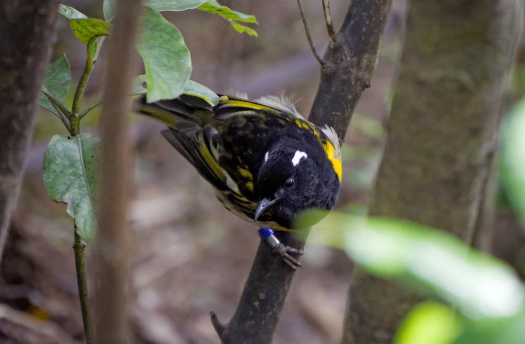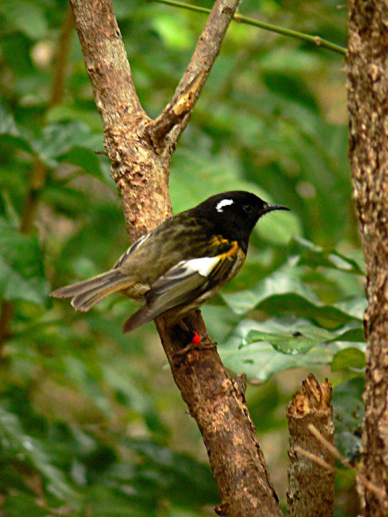 The stitchbird or hihi (Notiomystis cincta) is a bird now only found on New Zealand’s offshore islands and fenced mainland reserves. Males have a dark velvet cap and white ear-tufts, which can be raised at will. There is a yellow band worn across the chest, separating his black head from the rest of his body. The belly is grey, his bill somewhat pointed and curved down. Both males and females have a long tongue with a brush at the end and thin whiskers projecting out from the base of the bill.