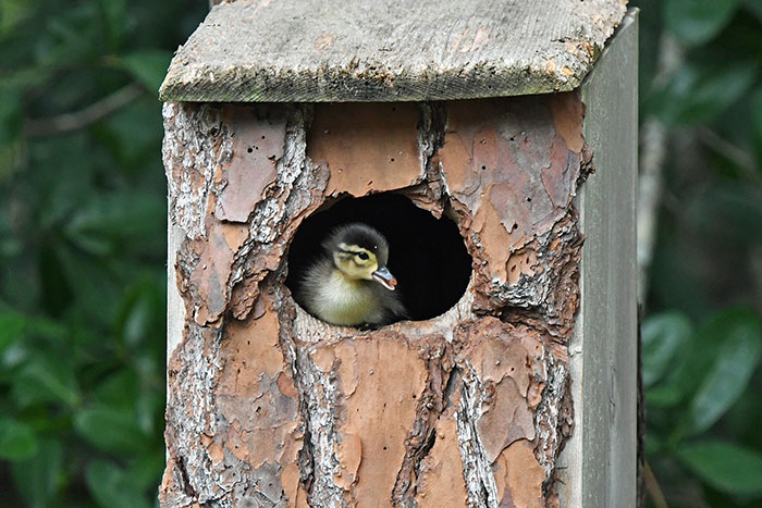 “The mother duck removed the egg from one of our nesting boxes and flew toward this other box with it in her bill,” Laurie told Bored Panda. “We believe that the duck moved the egg because that nest had been raided – there were eggshells at the bottom of the pine tree where the box is.”