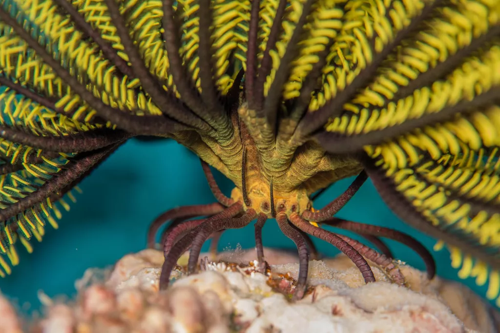 The photo is a close-up of a Crinoid, a species of starfish and sea urchins. They are called living fossils because they are present and have existed for more than 459 million years to the present day.