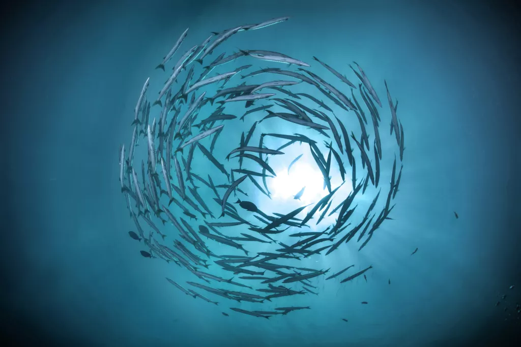 This breathtaking photo captures the moment a school of barracudas is curled into a vortex.