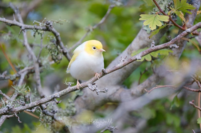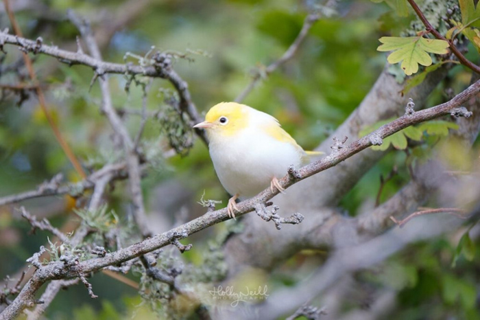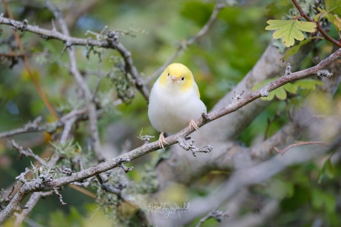 “Leucism is a genetic mutation that prevents pigmentation (especially melanin) from existing in the bird’s feathers,” Neill wrote. “Leucism is different to albinism as it only affects the bird’s feathers, and can cause some feathers to be brightly colored – in this case it’s yellow. Albinism on the other hand affects all pigment, including the eyes.