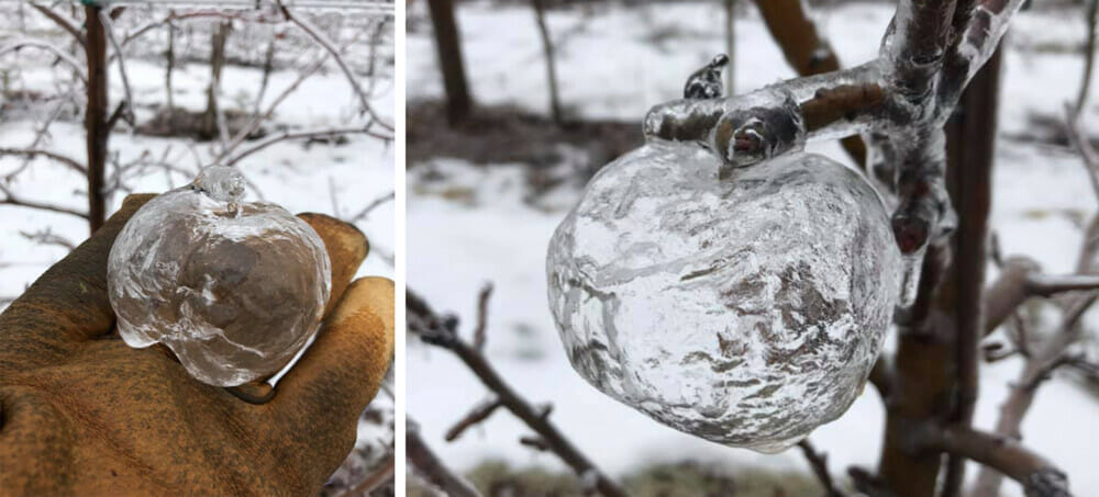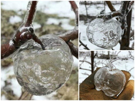 This phenomenon of nature occurs when freezing rain is deposited on the fruit and is “burning” it. Because of this, apples begin to decompose, leaving behind their appetizing appearance and appearing in the image.