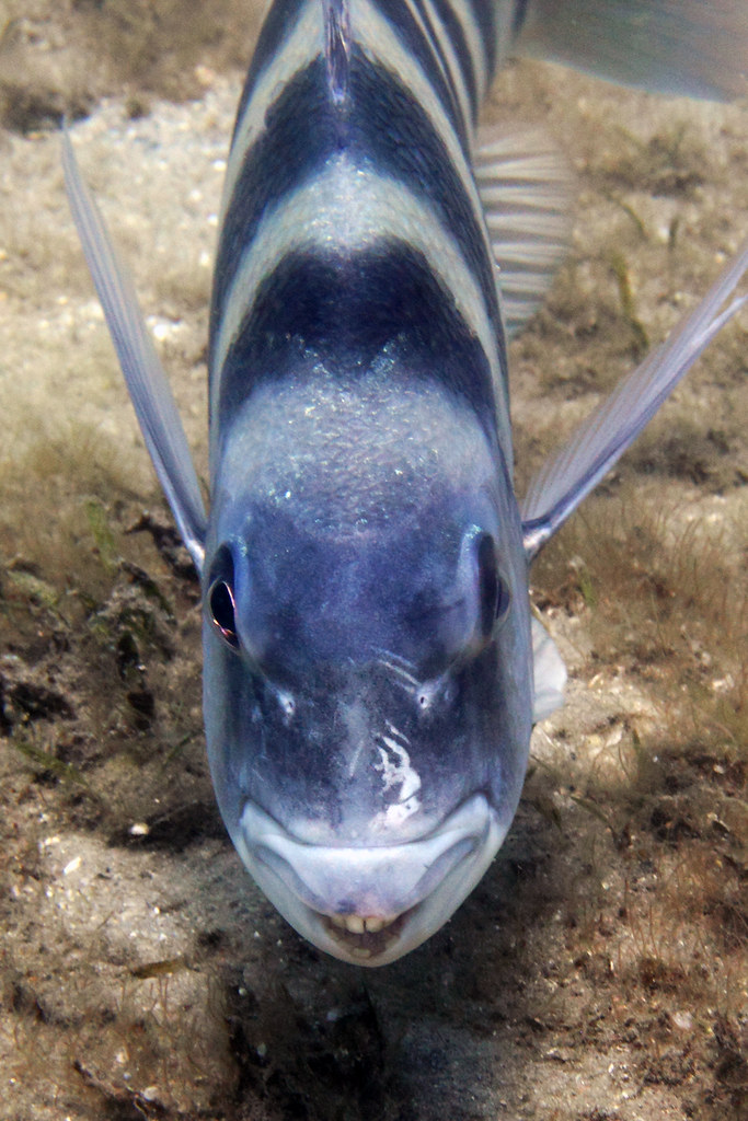 According to the Scientific American, “Sheepshead fish are a common North American marine species that span from Cape Cod and Massachusetts through to Florida and the Gulf of Mexico to Brazil. Preferring coastal habitats around rock pilings, jetties, mangroves, reefs and piers, they can grow up to around 91 cm in length and weigh up to 9.6 kg. They have five to seven distinctive black, vertical bars running down their silvery bodies, which is why the sheepshead is also called the convict fish.”