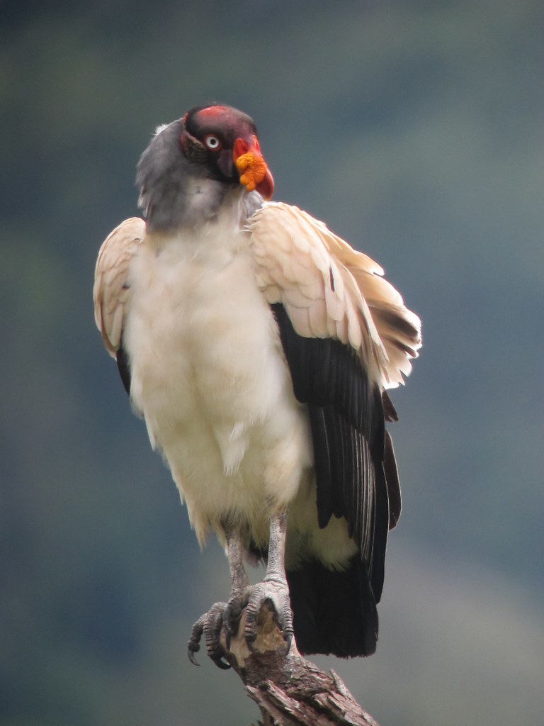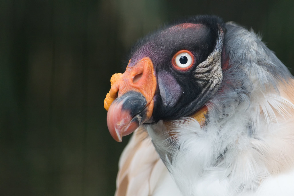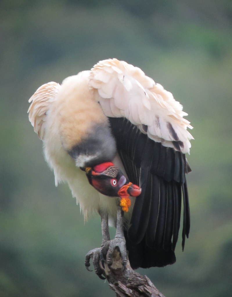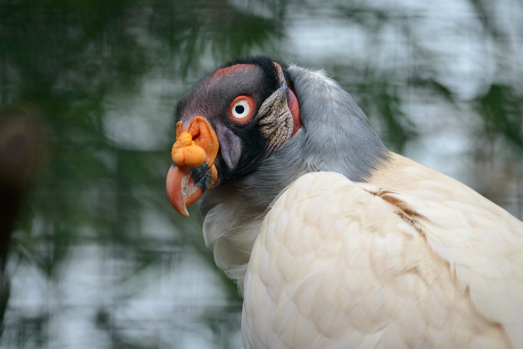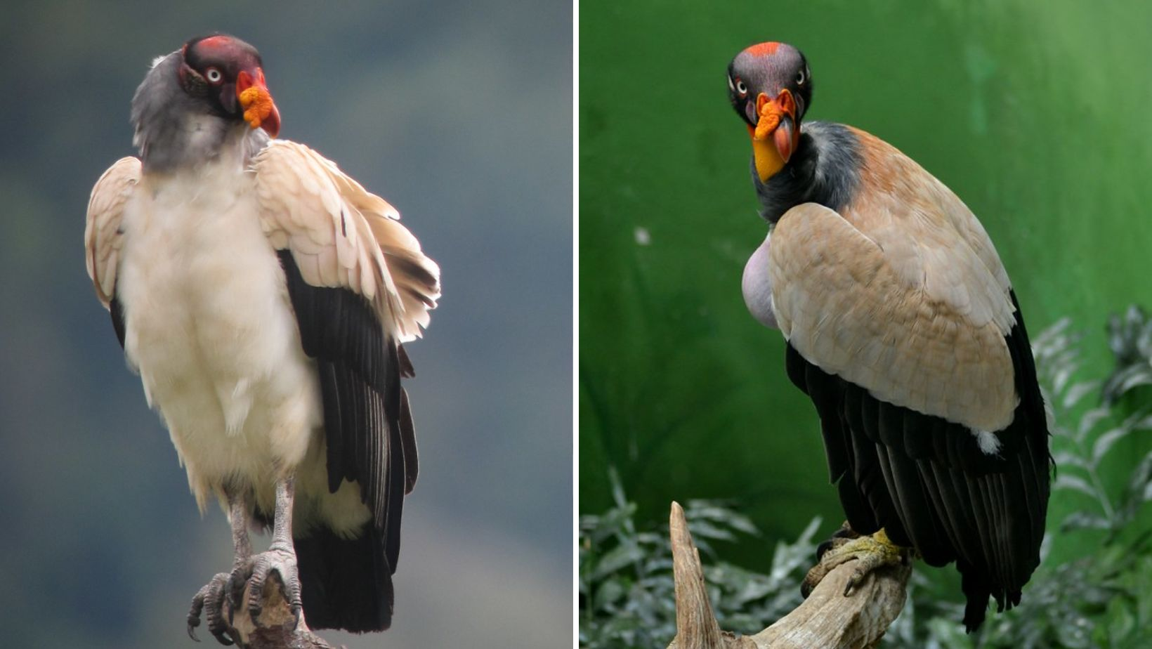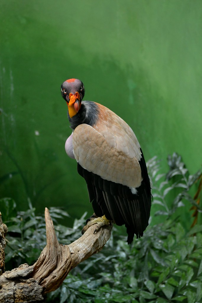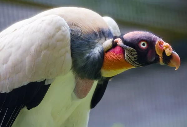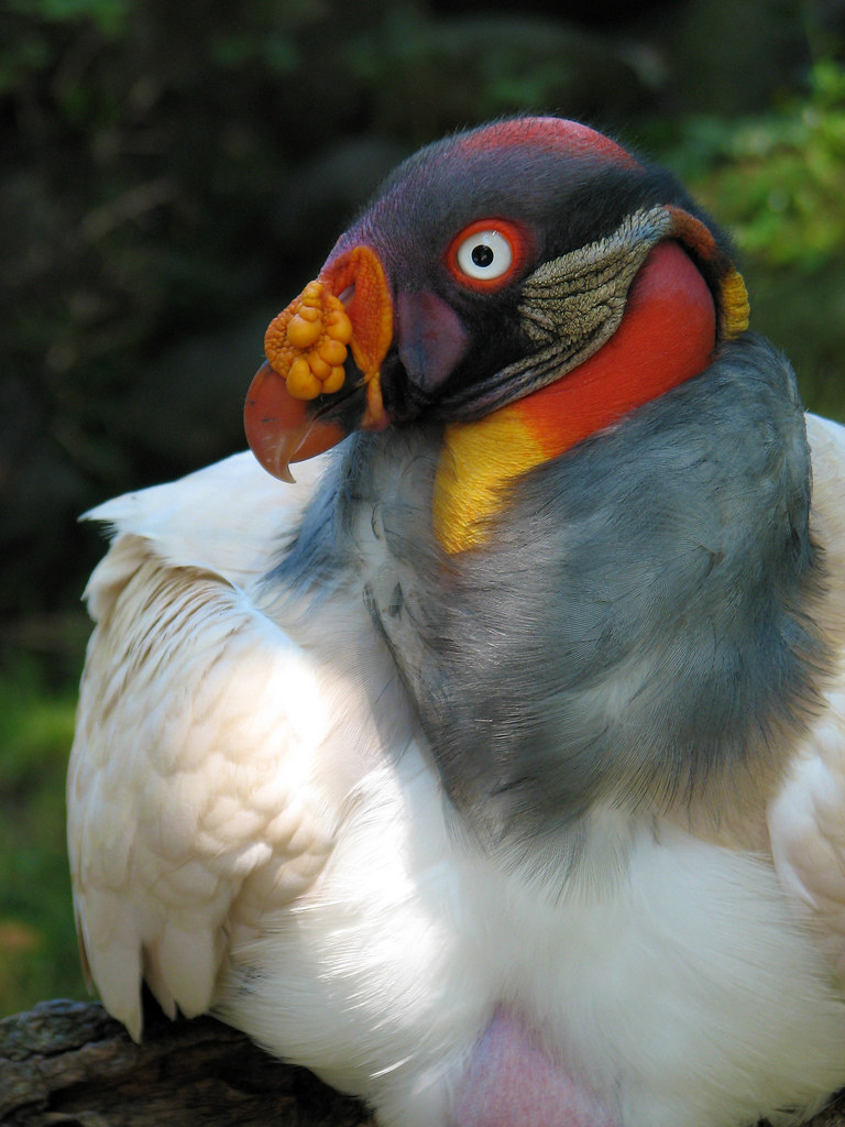 The king vulture (Sarcoramphus papa) is a large species of bird found predominantly in Central and South America. Excluding the two species of condors, the king vulture is the largest of the New World vultures. Its overall length ranges from 67 to 81 cm (26–32 in) and its wingspan is 1.2 to 2 m (4–7 ft). A large bird, their bodies are mainly white, while the head and neck are bald. However, the skin color in this area varies between, yellow, orange, blue, purple, and red. They also have a very noticeable orange fleshy caruncle on their beak.