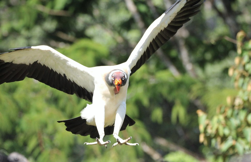 King vultures are scavengers feeding on fresh carcasses of many animal species. They mainly dinning on cattle carcasses to beached fish and dead lizards. A large vulture, they often displace smaller species of vultures from a carcass.