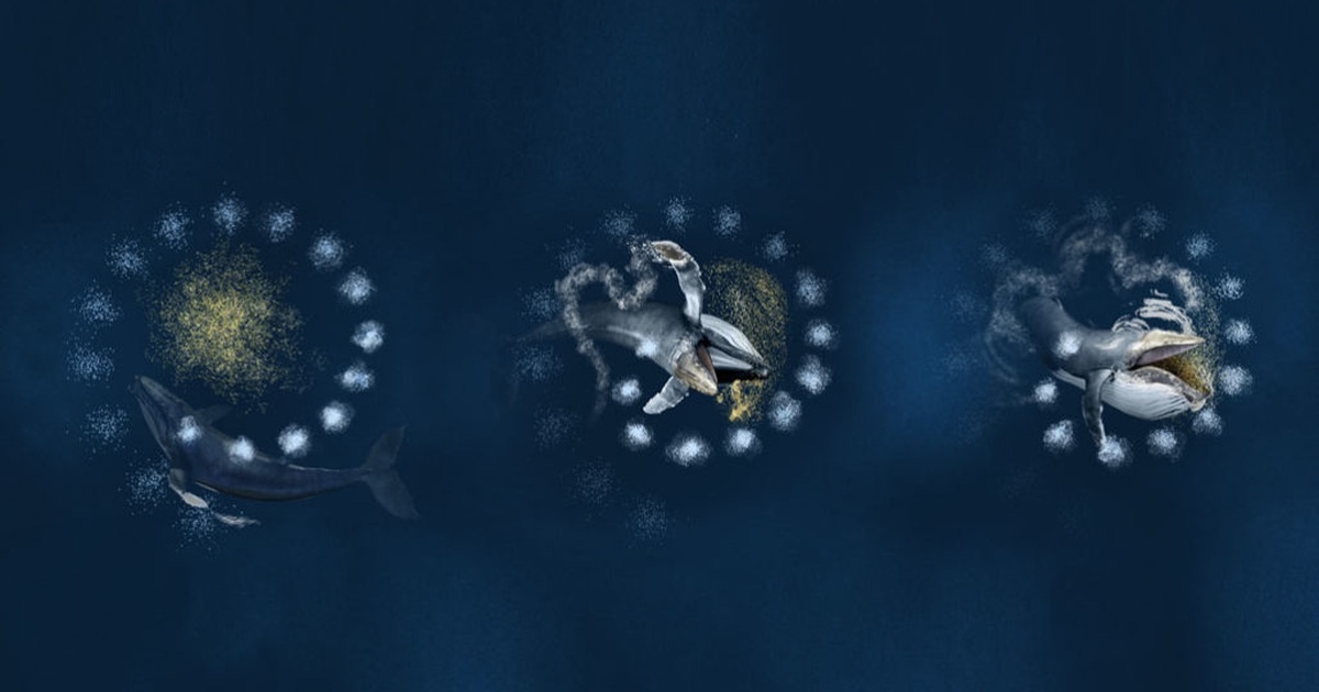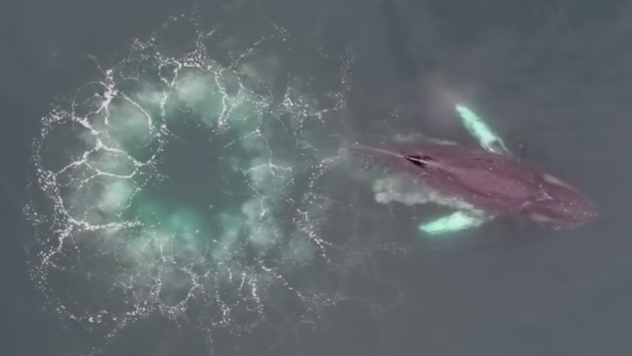 The video shows whales swimming around a school of fish in an ever-narrowing spiral, building an ever-narrower bubble wall with the air they blow out. Finally, they swallow their prey by swimming through the confined space with their mouths open.