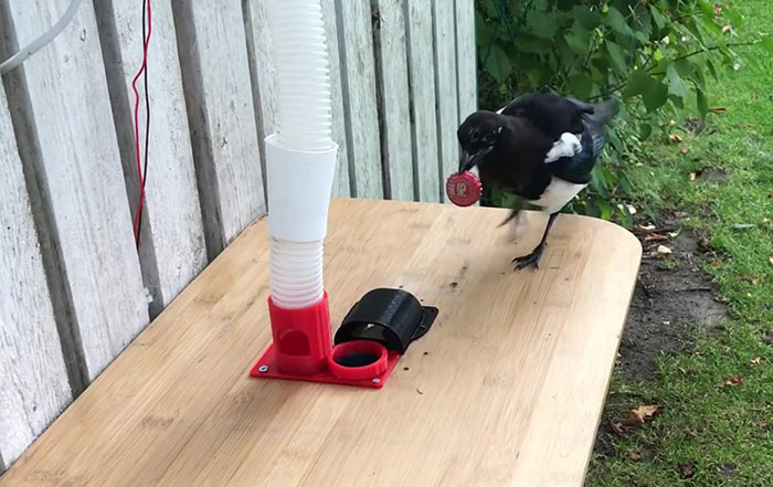 Whenever a magpie drops a bottle cap into the designated hole, it gets a treat from the dispenser