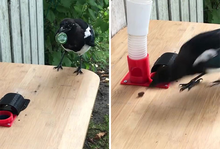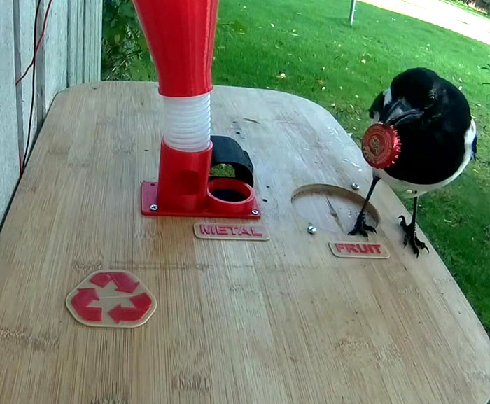 So, he trained the friendly neighborhood magpies to recycle bottle caps in exchange for food using a machine he built from scratch.
