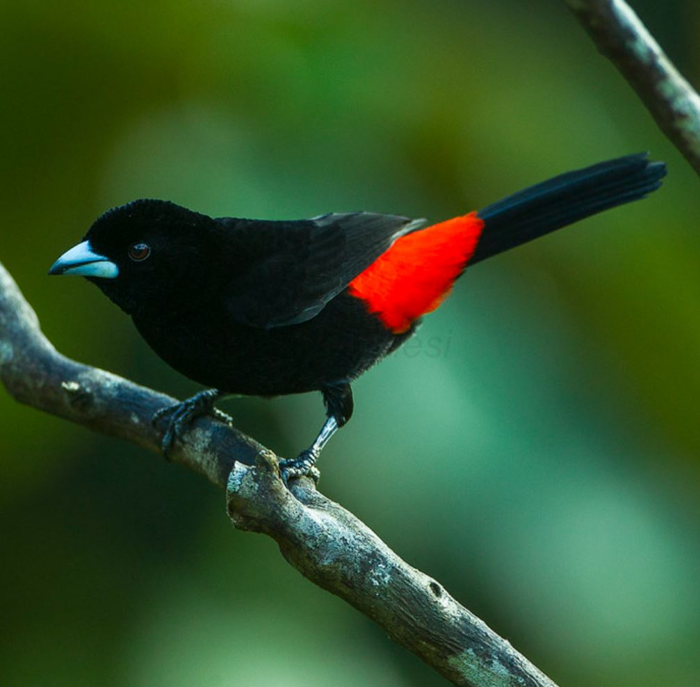 The flame-rumped tanager (Ramphocelus flammigerus) is a species of primarily black bird with the lower back, rump, and uppertail coverts either lemony yellow (subspecies icteronotus) or the same area warmer yellow to orange, crimson, or scarlet (subspecies flammigerus). The birds with less scarlet have been interpreted as hybrids or intergrade species.