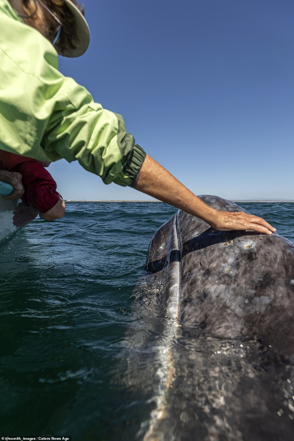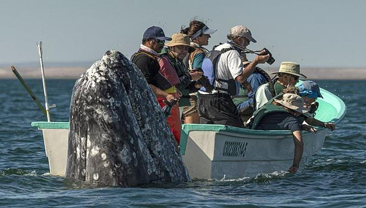 Like other large whales, humpbacks were once the target of the whaling industry which nearly hunted them until extinction. A worldwide moratorium in 1966 outlawed hunting, and their numbers have partially recovered since. Pictured: One of the whale watchers pats a humpback whale from a sightseeing boat off the coast of Mexico. What an amazing, once-in-a-lifetime encounter!