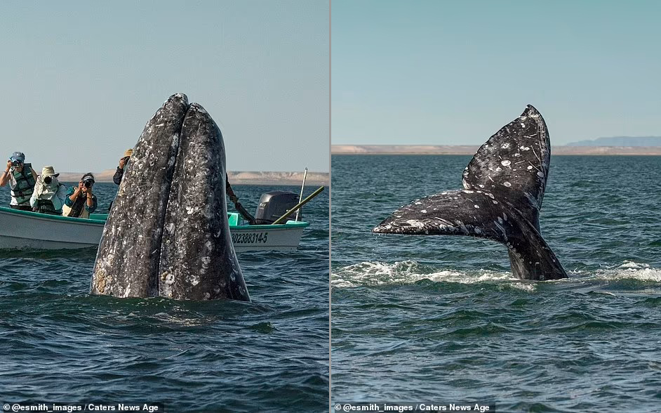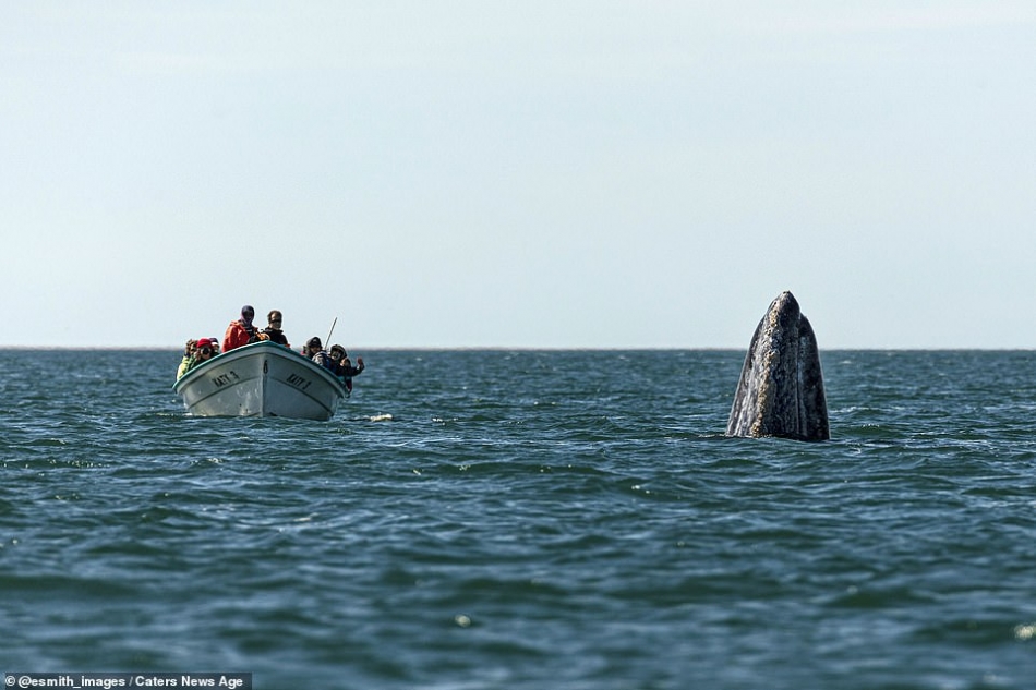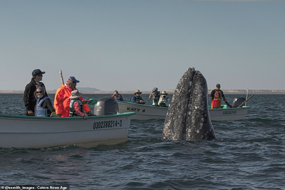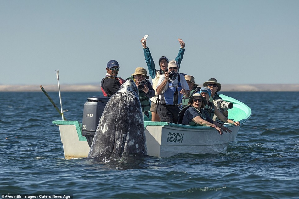 But before the creature could disappear into the sea again, the whale watchers spotted her at the last second, with a second photograph showing their jubilation at the close encounter. One woman standing on the boat is shown throwing her arms into the air to celebrate, while the other sightseers sit open mouthed in surprise and click away on their cameras. The whale watchers’ near-miss was captured by director and photographer, Eric J Smith during a trip to San Ignacio Lagoon, in Baja California Peninsula, Mexico. Pictured: Two boats of whale watchers have a close encounter with the sperm whale off the coast of Baja, Mexico. Smith, a 49-year-old from Los Angeles, said the whale ‘slowly and silently stuck her head high above the water to look around. I was in another panga a few dozen feet away and caught the moment right before everyone realized she was so close.’