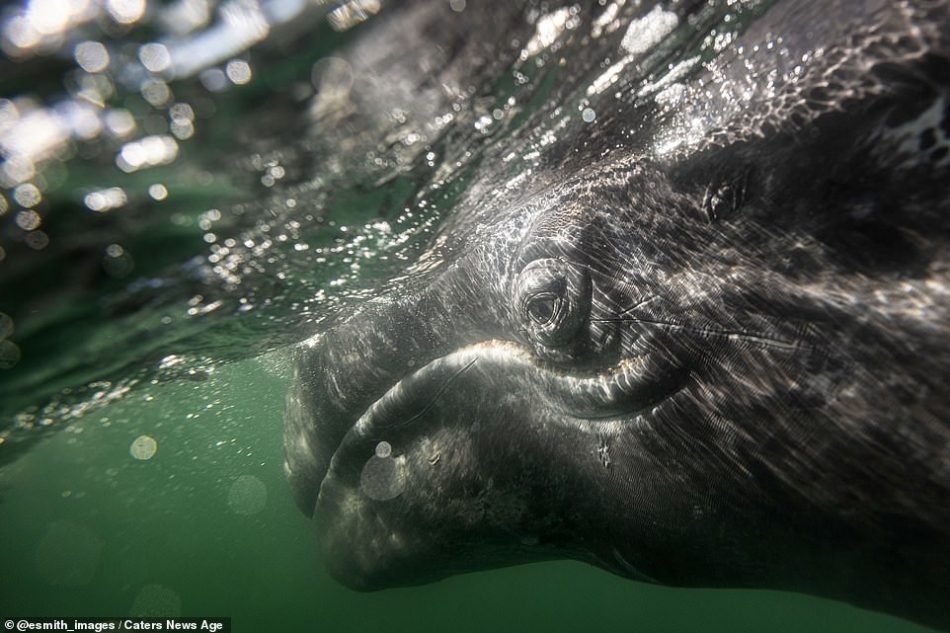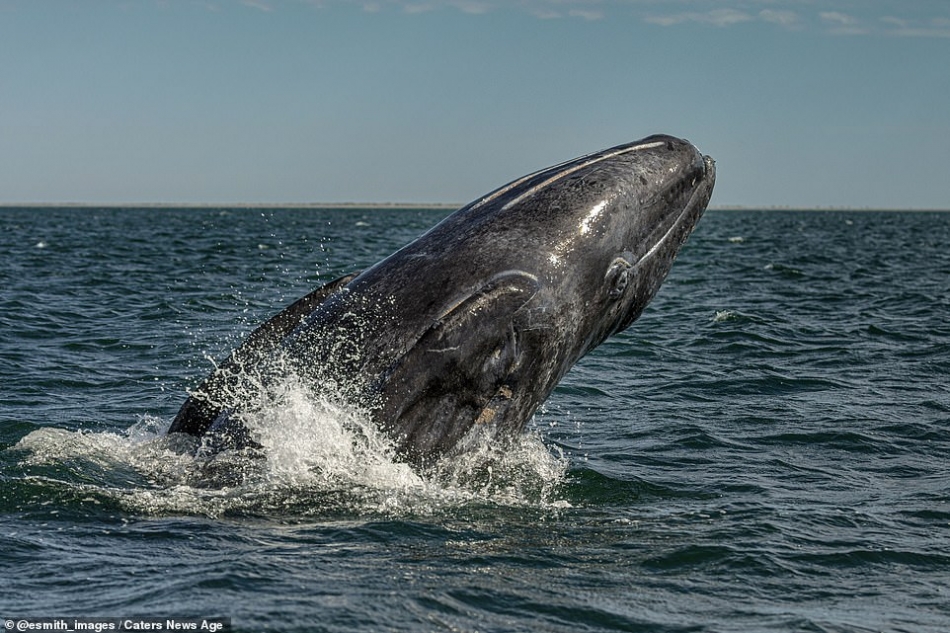 The whale watchers’ near-miss was captured by director and photographer, Eric J Smith during a trip to San Ignacio Lagoon, in Baja California Peninsula, Mexico. The 49-year-old from Los Angeles, said: ‘She slowly and silently stuck her head high above the water to look around. I was in another panga a few dozen feet away and caught the moment right before everyone realized she was so close.