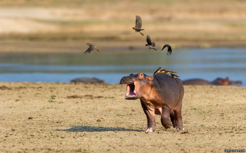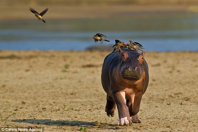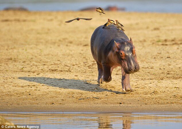 These hilarious moments were captured at the South Luangwa National Park in Zambia by photographer Marc Mol. He was concentrating on a pod of hippos when he saw the baby hippo running toward him with the oxpeckers on its back.