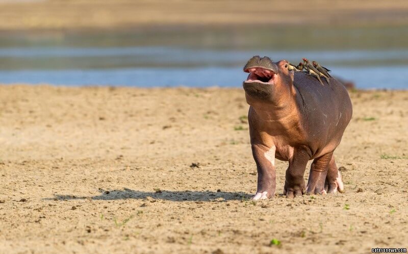 “I’m Not Kidding”, Baby Hippo Yells Out For Help After A Bird Flock Land On Its Back