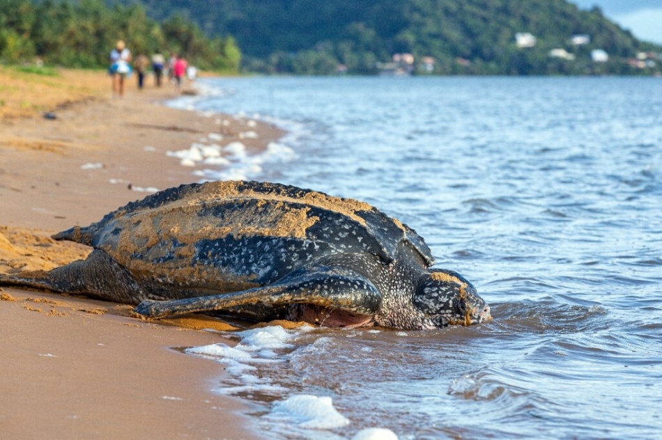 This is the moment the world’s largest sea turtle emerges from the water onto the beach. It is a majestic leatherback turtle, and it seems to have come out of the water to rest upon the sand.You can watch video at the end of the this article.