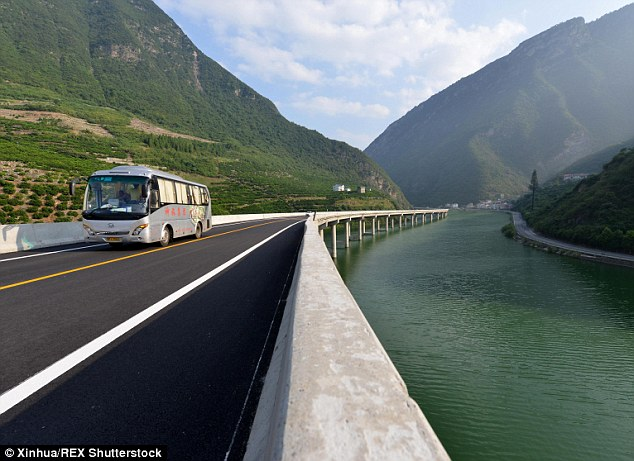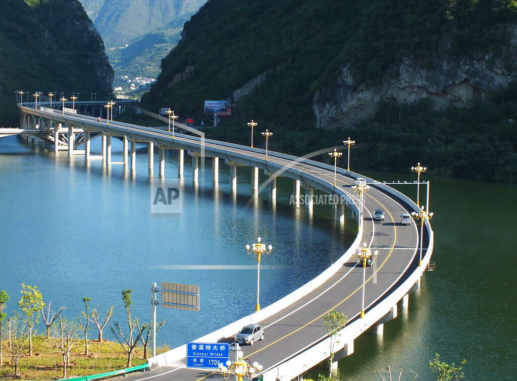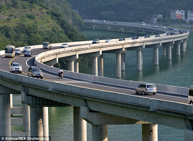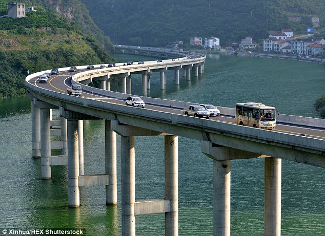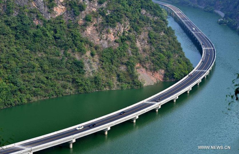 A mountainous river valley in China’s Hubei province is home to one of the Asian country’s most impressive pieces of infrastructure – a highway bridge that runs through the middle of a river.