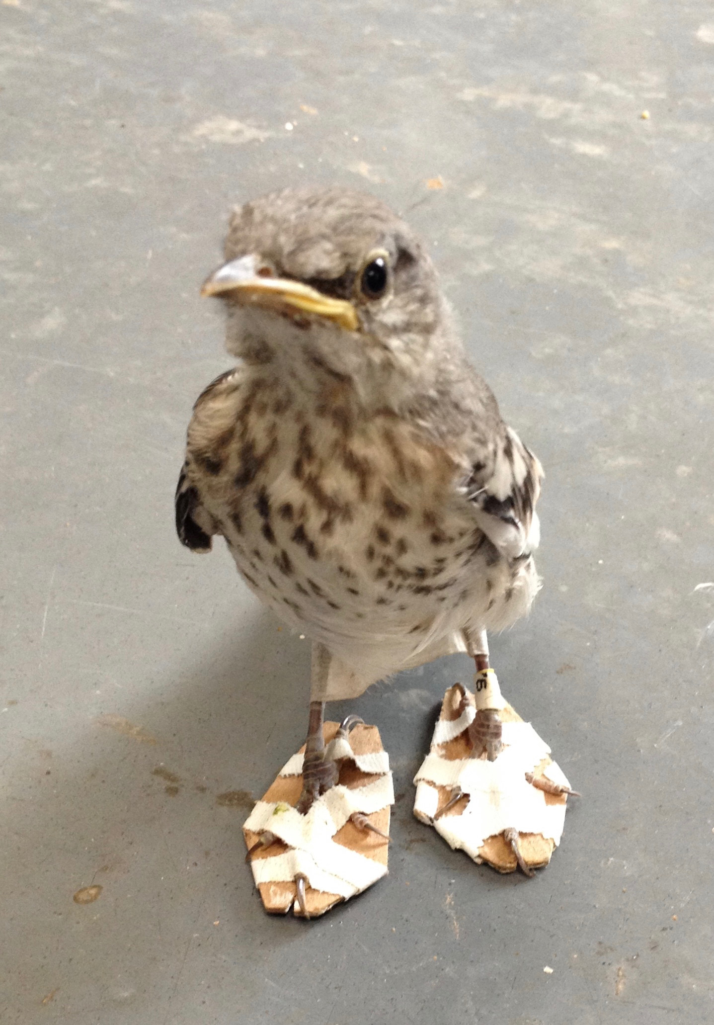 What do you do when you find a tiny Northern Mockingbird with impaired feet? You take some cardboard and tape, add a bit of creativity and come up with an awesome solution to fix it!