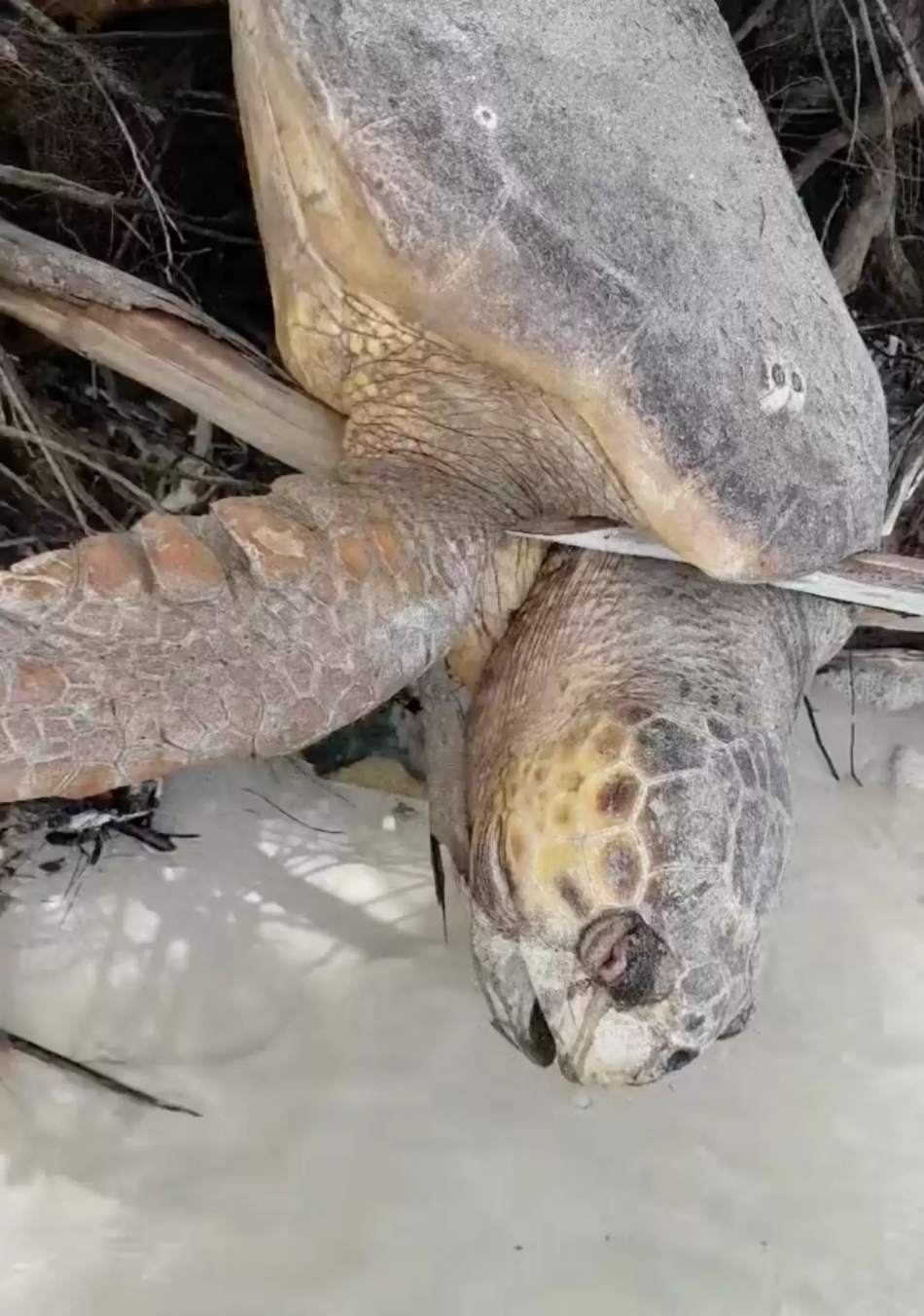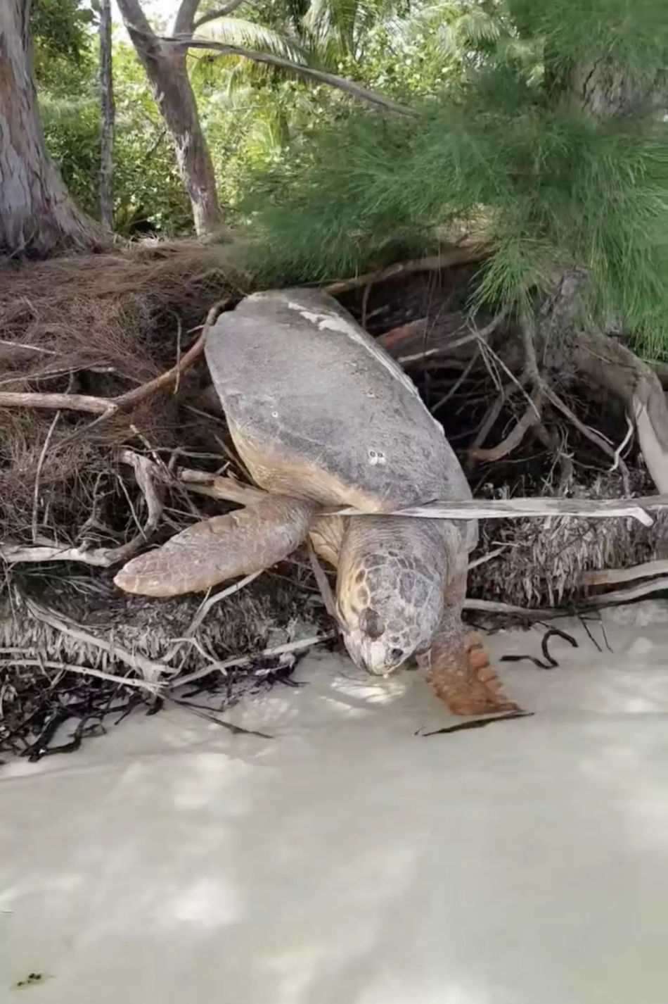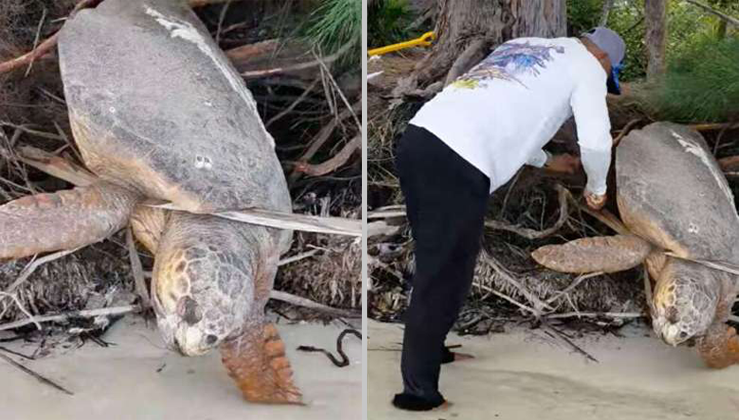 Though the turtle appeared to have been trapped there for some time, and likely had perished, Escobar decided to take a closer look anyway — just in case. She remained motionless as he pulled the boat to shore and approached. “When I touched her, she instantly let out a sigh and she started to move her head,” Escobar said. And with that, Escobar sprang into action.