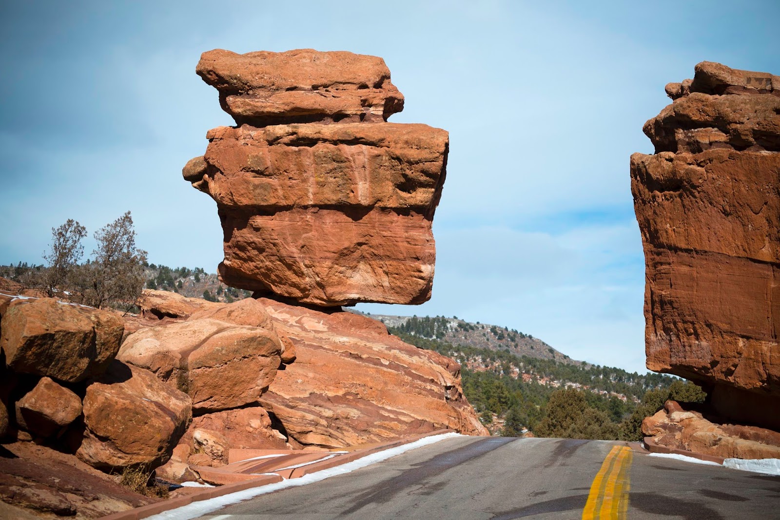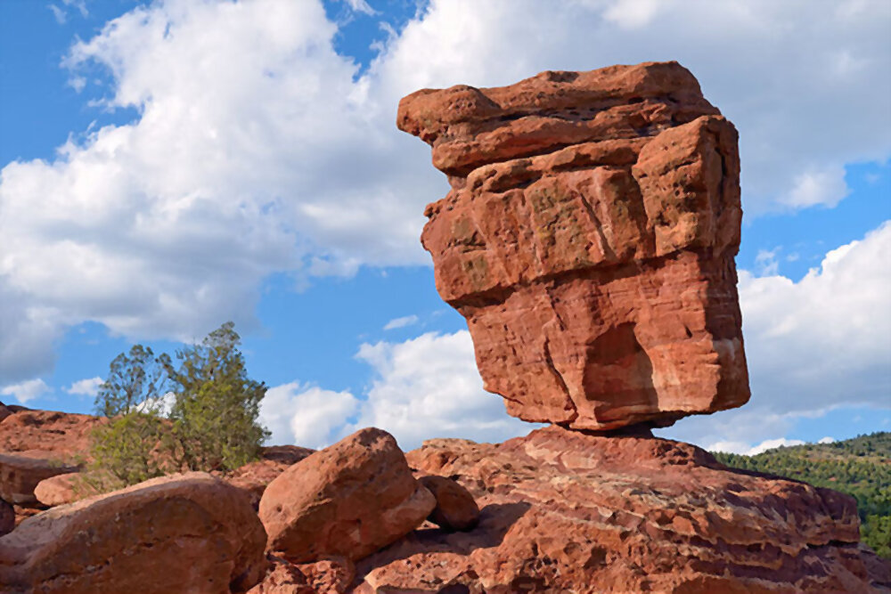A huge sandstone boulder hangs dangerously near the roadway in Garden of the Gods Park near Colorado Springs. The park’s famous red rocks formed millions of years ago due to disruptions in the earth’s surface by erosion. The rock is a conglomerate of red, pink, and white sandstone and limestone. This 700 tons weight Rock rises 35 feet above its base.