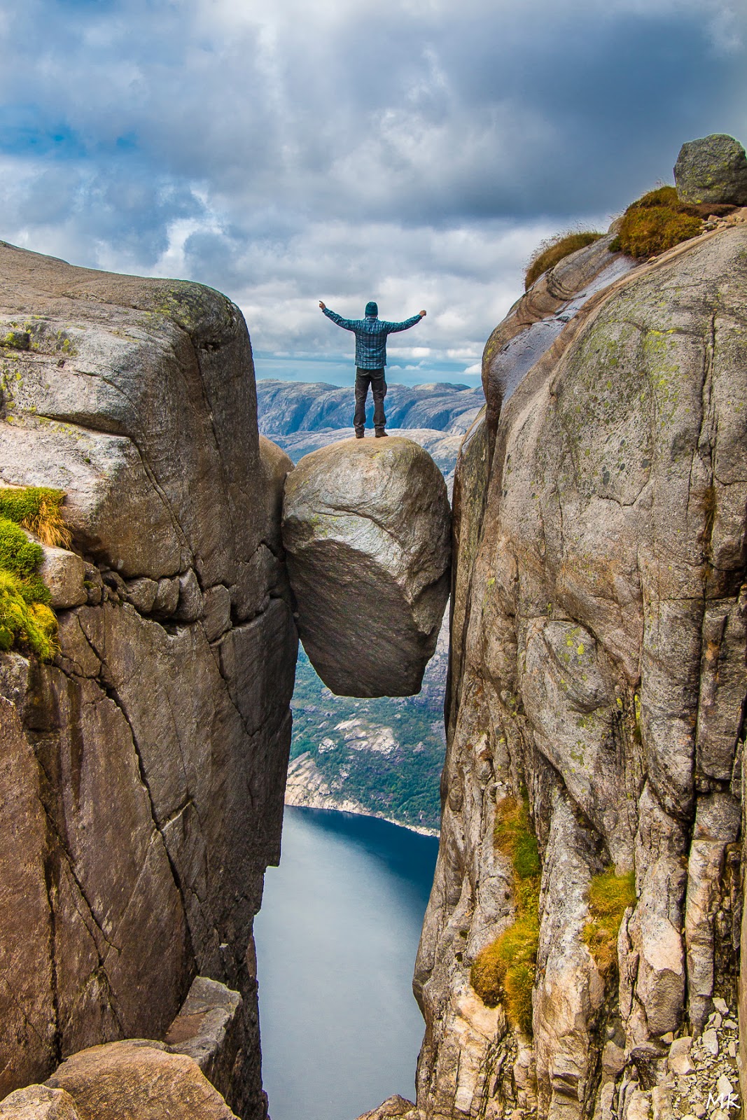 It is a boulder on the mountain Kjerag in Rogaland County, Norway. The rock itself is a 5-cubic-meter glacial deposit trapped in the mountain’s crevasse. It is a popular tourist destination and is accessible without any climbing equipment. However, it is hanging above a 984-meter (3,228 ft) deep valley.