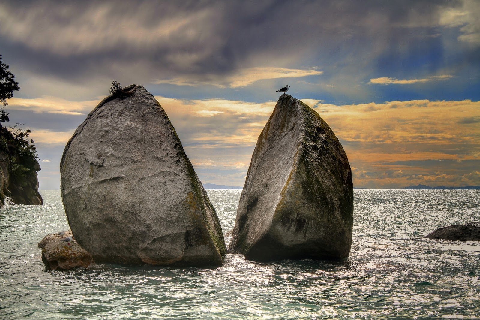 Split Apple Rock is a geological rock formation in Tasman Bay off the northern coast of the South Island of New Zealand. This granitic rock from the cretaceous era looks like an apple that has been cut in half. The crack to produce two sides of the ‘apple’ was a naturally occurring joint which commonly occurs in granite. These joints and cracks in granite are very weak and susceptible to weathering. According to traditional Maori mythology two gods breaking apart the rock to form its shape. It is a popular tourist attraction in the waters of the Tasman Sea.