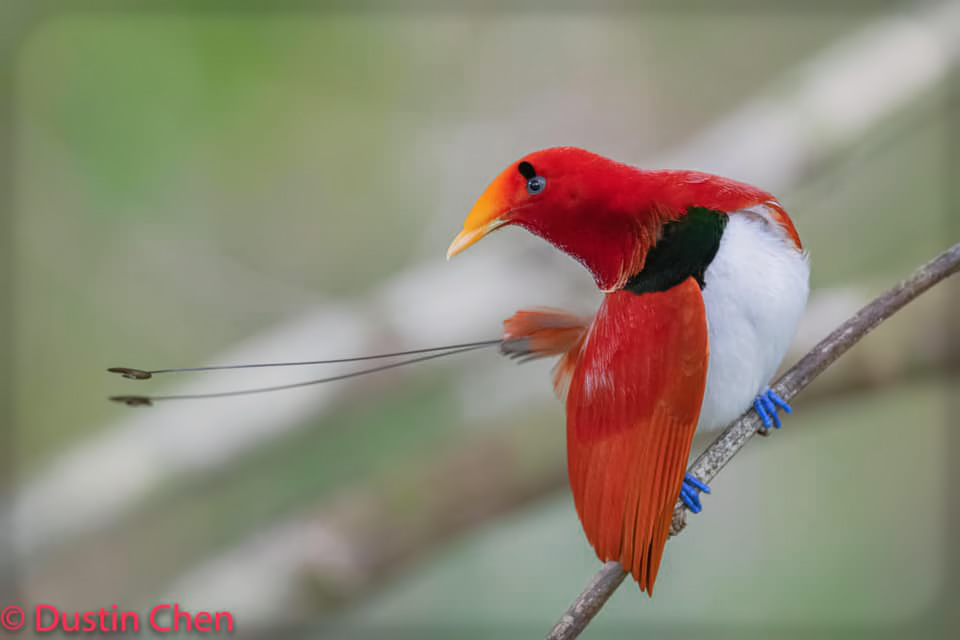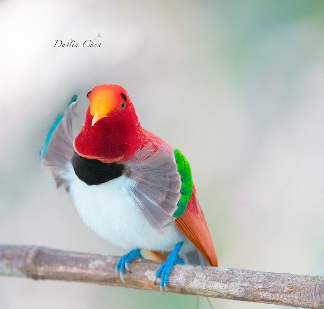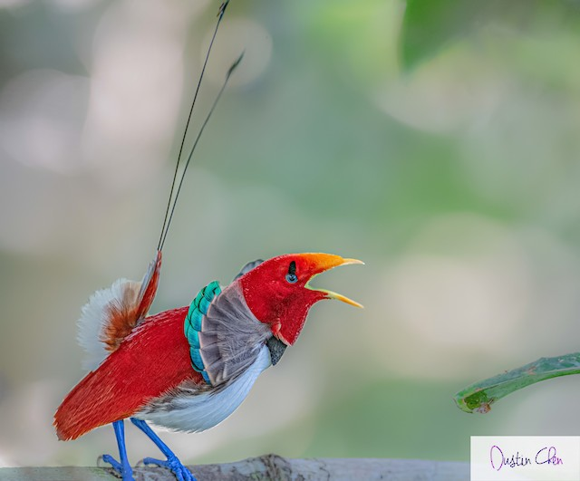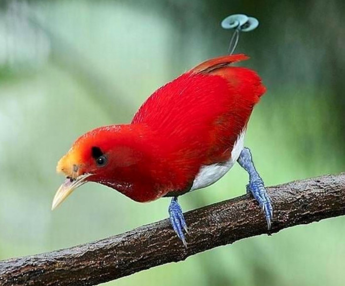 The king bird-of-paradise (Cicinnurus regius) is a passerine bird of the Paradisaeidae (Bird-of-paradise) family. Males are easy to recognize due to their bright red color and two long, ornamental wire-like tail feather shafts, as well as the circular swirl of feathers, colored bright green, on the ends. Their bellies are white, and there is a green stripe across the chest.