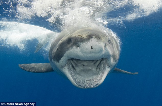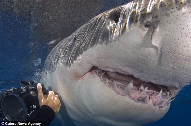 Rather you than me: In this image, Andy is almost able to reach out and touch the teeth of a great white