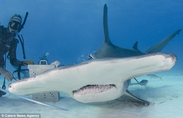 A selfie with a difference: Andy pops up in shot for this close-up with a hammerhead shark