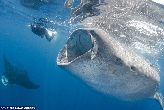By using a mixture of fish and squid to attract the sharks, Andy waits until their mouths are fully extended before taking each shot – and has never once been harmed.