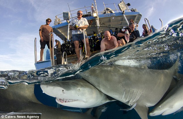Anyone for a swim? This unnerving picture shows a crowd of sharks waiting under a dive boat