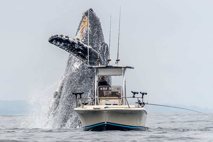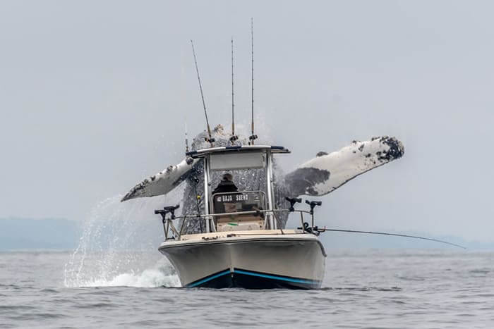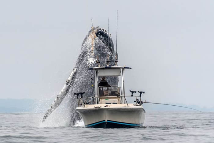 Once-In-A-Lifetime Footage Of A Massive Humpback Whale Leaping Out Of The Water Next To A Fishing Boat