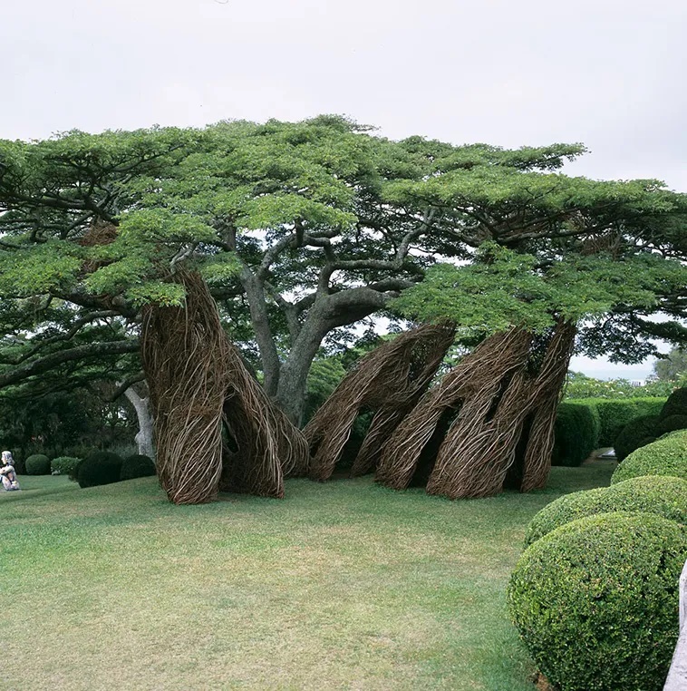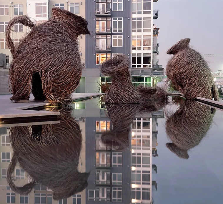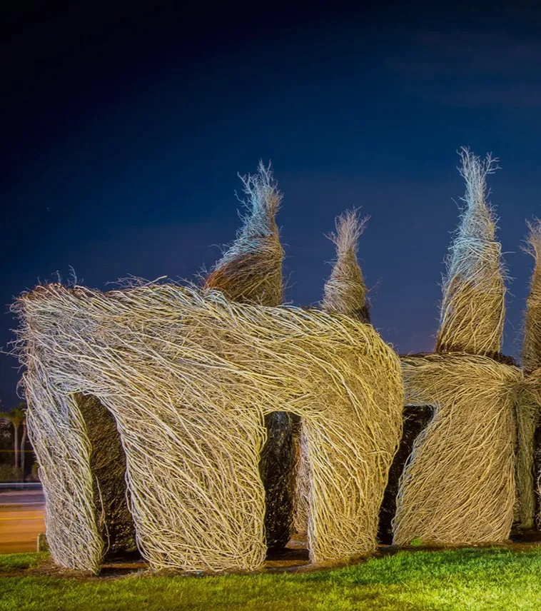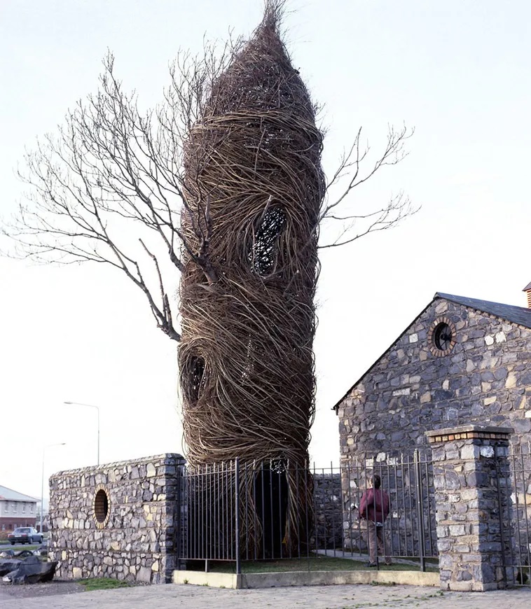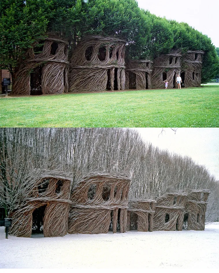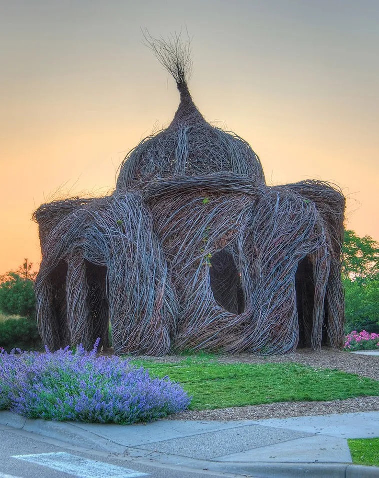 Patrick Dougherty is a sculptor who uses living trees as an unusual medium. He has created over 200 site-specific sculptures by weaving the saplings of trees into huts, water pitchers, cocoons, etc. Among his installations, the most famous ones are the nest houses that he produced worldwide. For constructing these nest houses, Dougherty uses different tree types including birch, aspen, maple, and pussy pillow, and creates huts reaching 20 to 40 feet in height. Unfortunately, due to the nature of trees, his works cannot last for a long time.