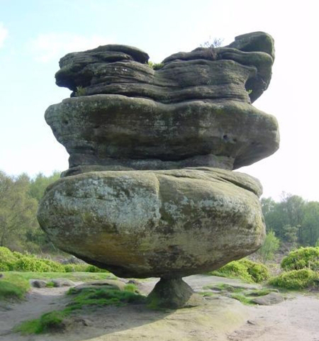 One of the balanced rocks at Brimham Moor, North Yorkshire, England has been shaped over time by wind and water erosion to its current form. The bottom layer is eroded the quickest.
