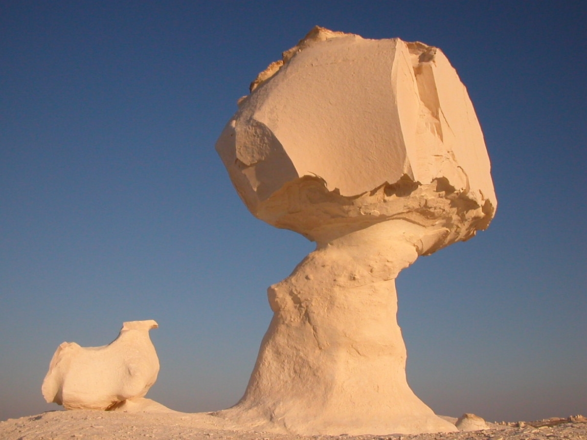 A limestone rock in the White Desert, Egypt. Rocks like this are scattered throughout the desert and are known as mushroom rocks. Unlike other balanced rocks, mushroom rocks were originally a single rock that eroded differently in various sections.