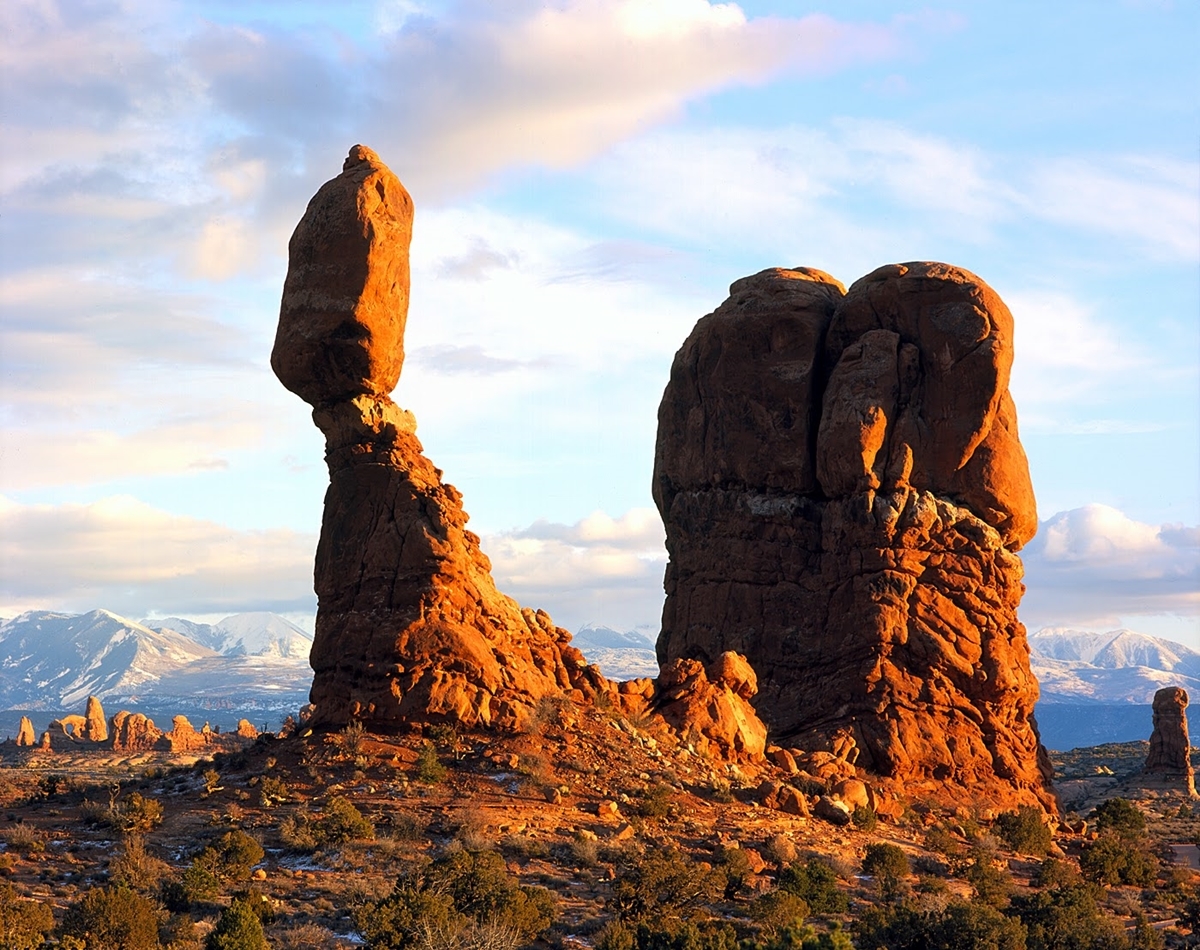 Capped Rock, a famous balanced rock in the Moab Desert, Utah, USA. The varying erosion effects of wind on different rock layers are the cause of this rock’s formation. Places with balanced rocks are always in areas with a solid and stable geological structure.