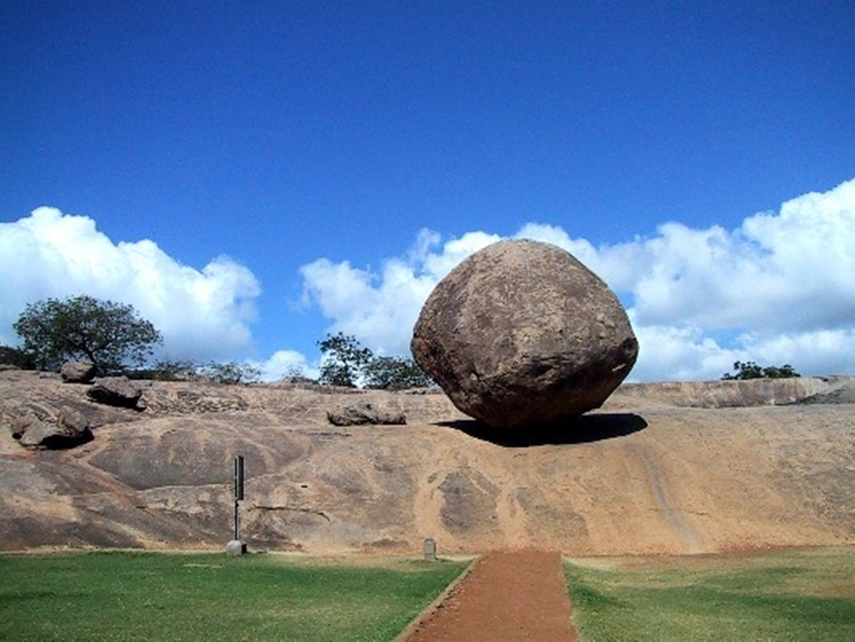 “Krishna’s Butterball” is a famous glacial erratic perched on a hillside near Mamallapuram, India. It is a large boulder that appears to defy gravity, as it is perched precariously on a steep slope. The boulder’s name comes from a Hindu legend that relates to the god Krishna and his love of butter.