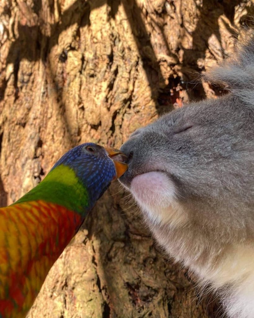 But the koala didn’t seem to like the kiss of his friend. After the lorikeet pecked, the animal licked his nose.