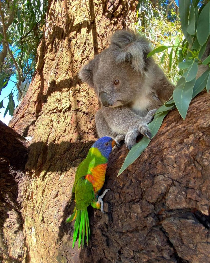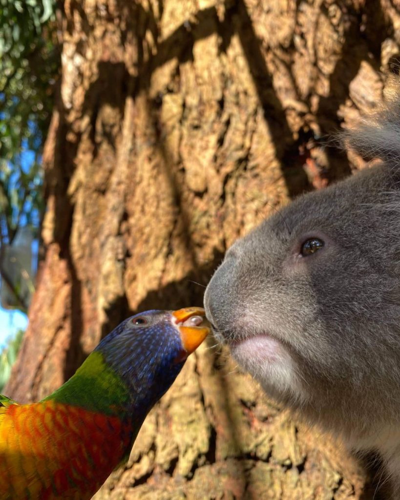 The unusual companions have been saved and required in SWV Victoria, Australia, for the Mosswood Wildlife Refuge. When he was just one year old, the koala lost his mother in a tragic accident. The personnel at the harbor, also in the comfort of his apartment, arrived to rescue him. The lovely child is already two years old and grows up in love and care of people below. He reached the shelter just a few months ago as far as the cheerful and energized rainbow lorikeet was concerned. Some passers-by saw the weak bird, flightless on the ground.