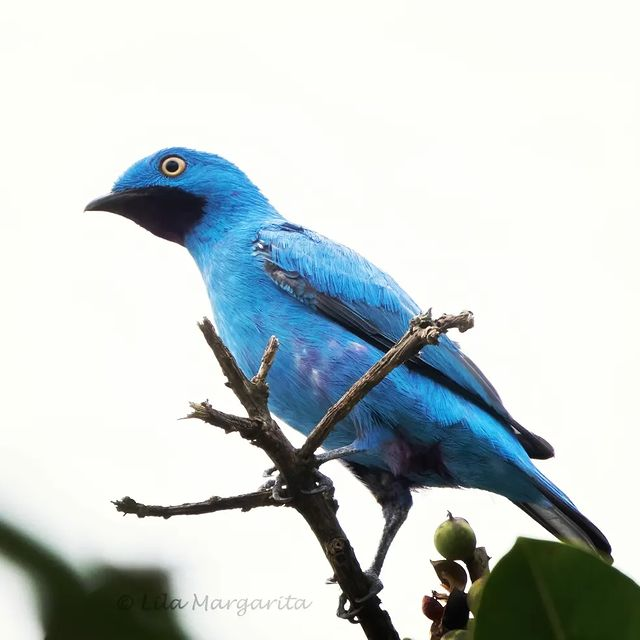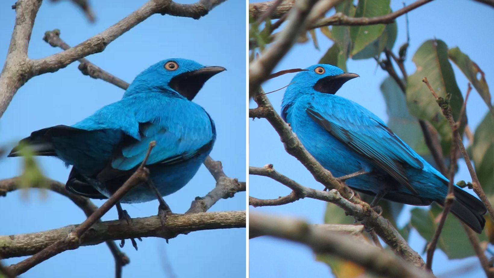 The plum-throated cotinga (Cotinga maynana) is starling-sized, and the males are predominantly blue in color, with a violet-colored throat. and light eyes; outer primaries are black and attenuated. These birds weigh in at 2.5 oz (70 g).