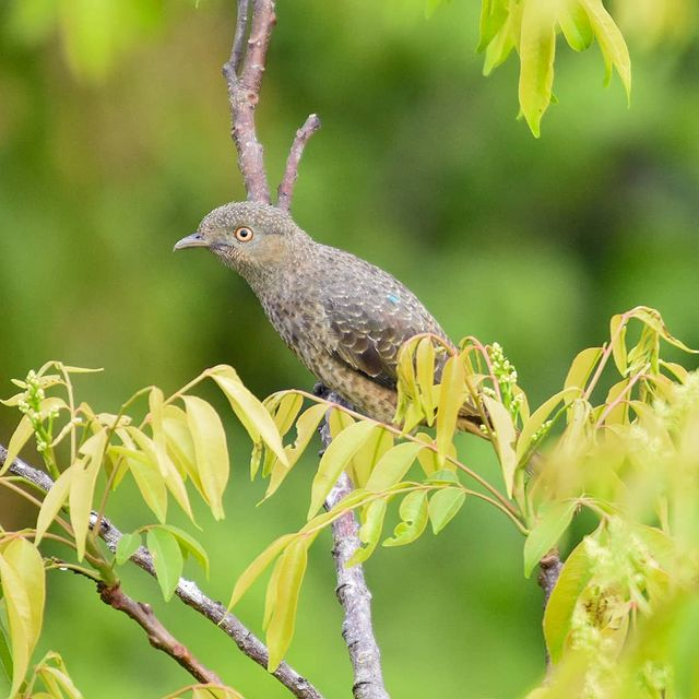 The female is overall brown with indistinct buff scaling on upperparts and light spotting below; eyes usually light.
