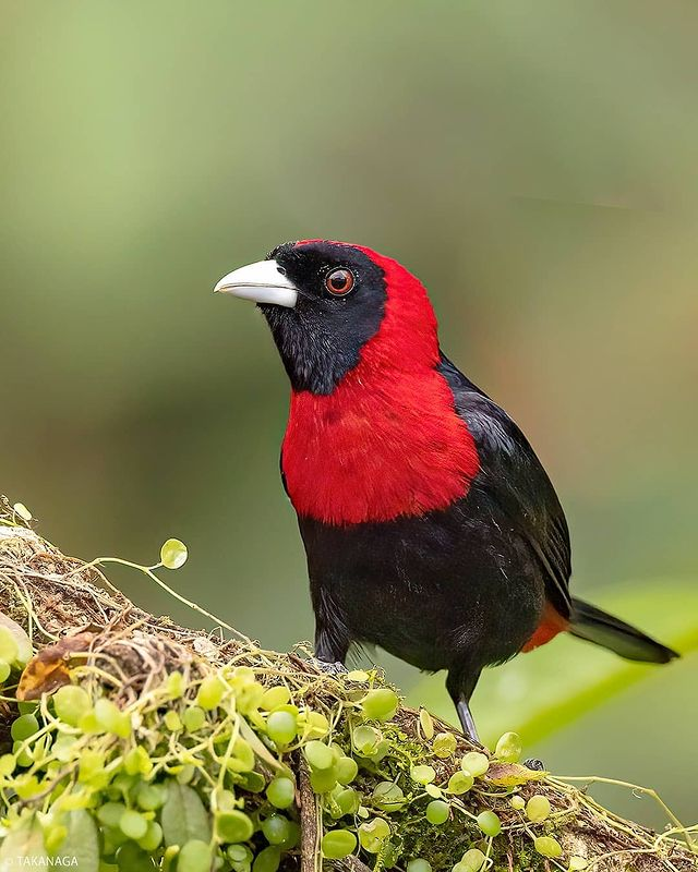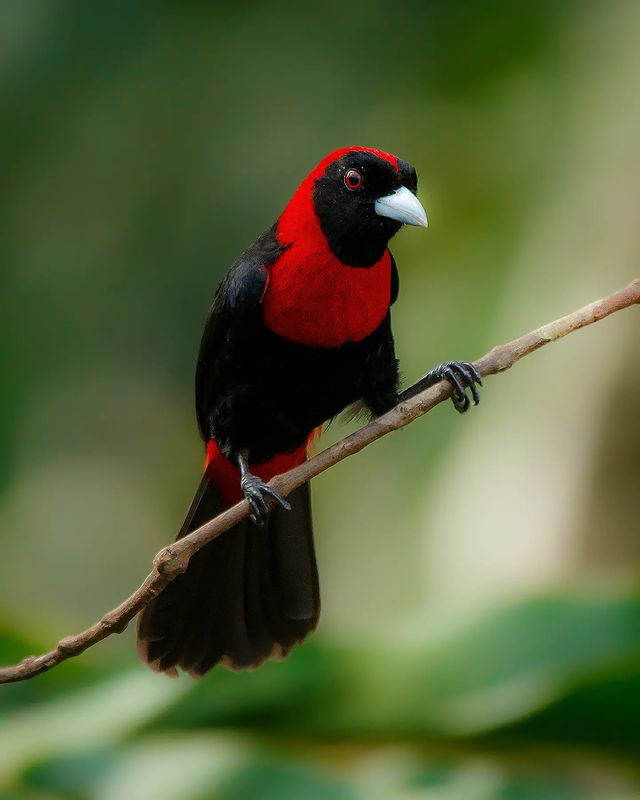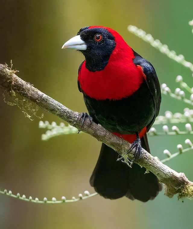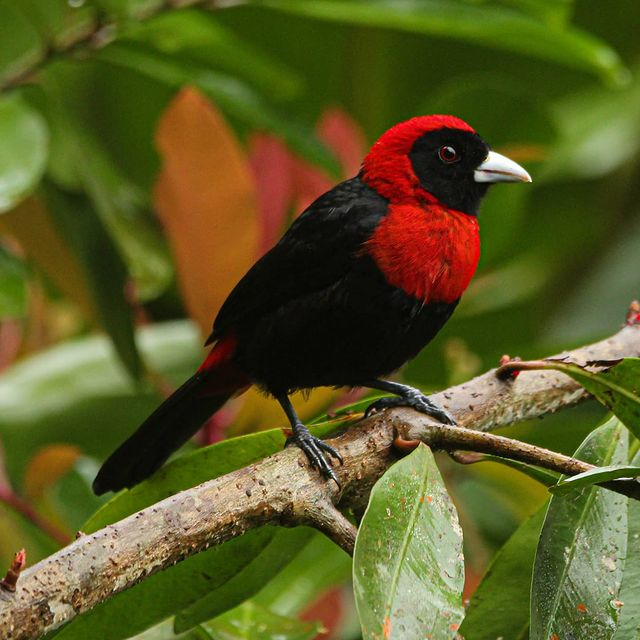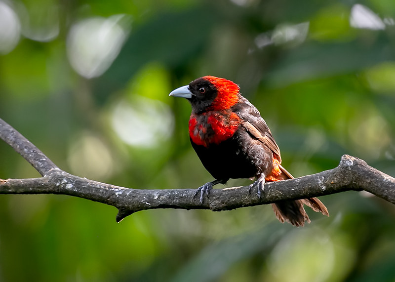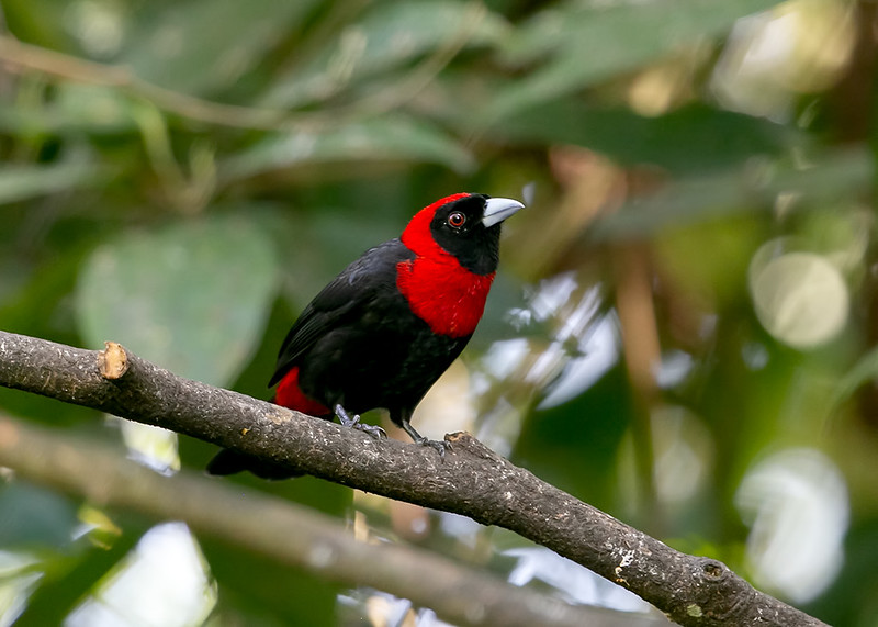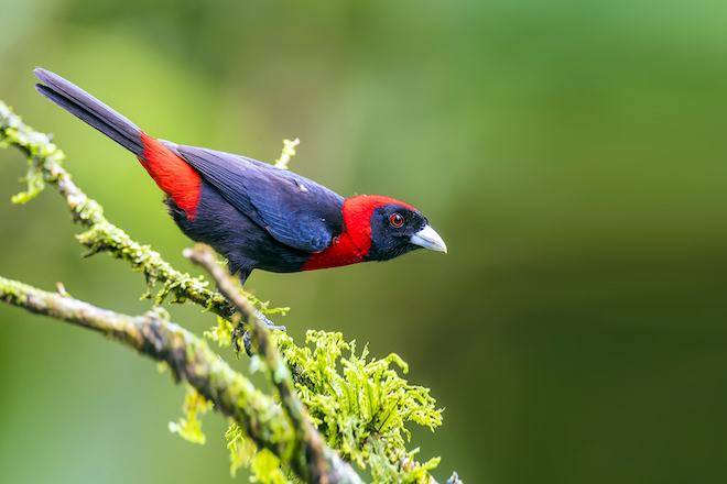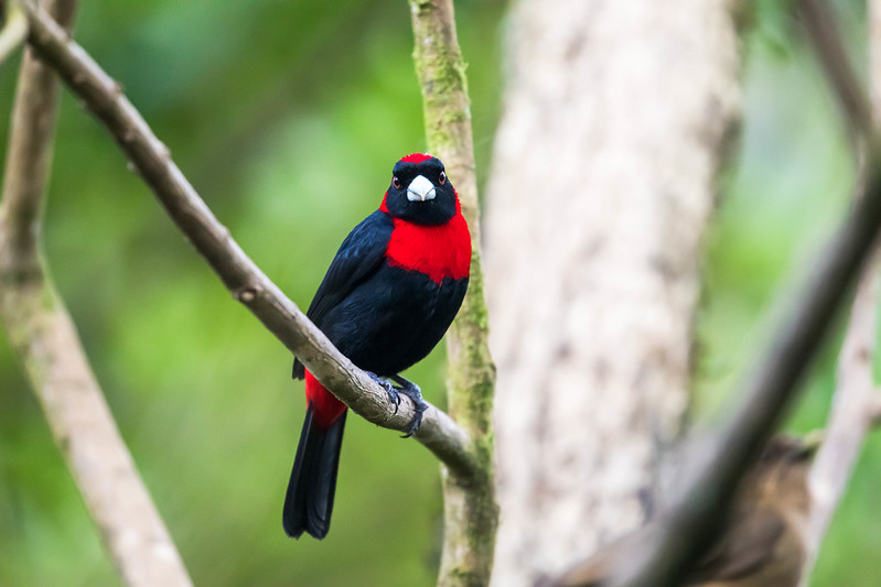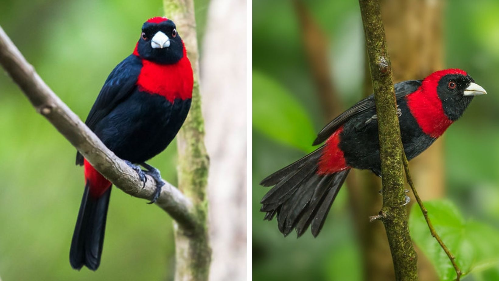 A beautiful velvety black bird with a bright bluish-white bill and a glossy crimson collar and rump, the Crimson-collared Tanager.