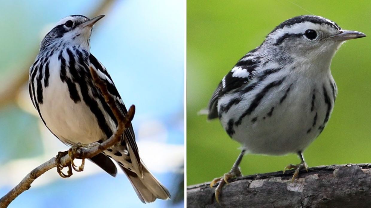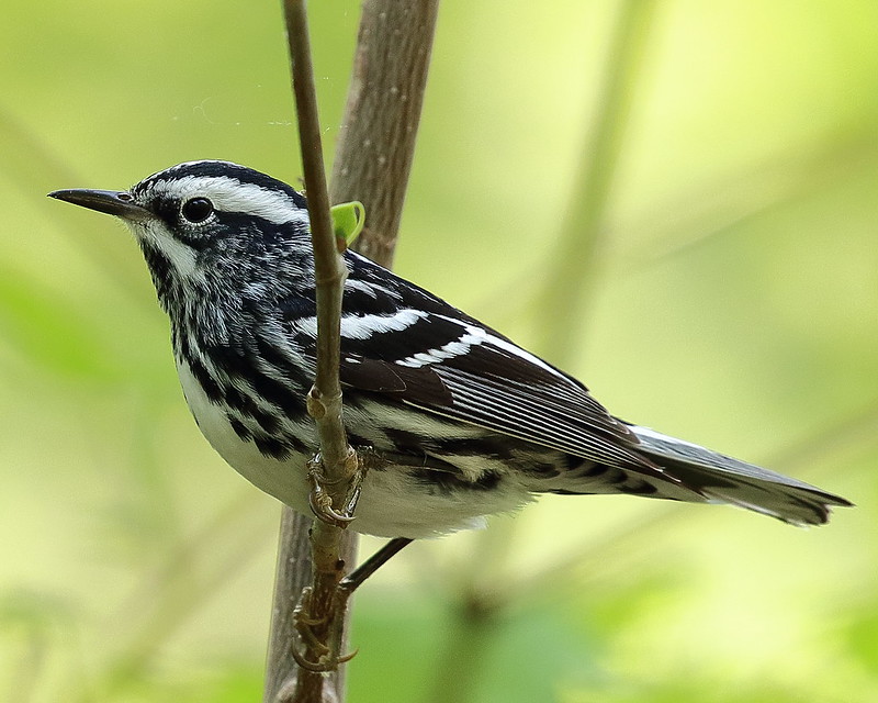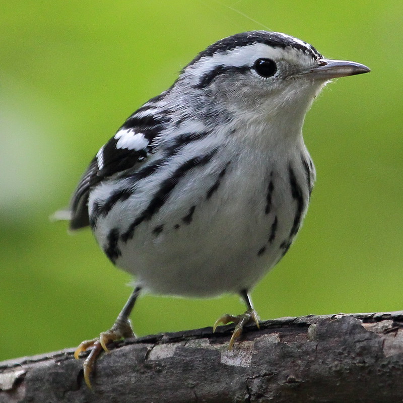The black-and-white warbler (Mniotilta varia), is a species of New World warbler, and the only member of its Mniotilta genus. These birds, measuring 13 cm in length, are boldly striped in almost parallel lines of black and white. Their black wings are highlighted by two wide, white wing bars. Adult males are far more boldly striped with black streaking, especially on their bellies and cheeks.
