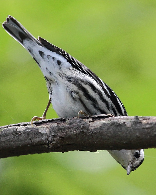 Black and white warblers dine on insects and spiders, hunting like a nuthatch, foraging up and down branches and trunks.