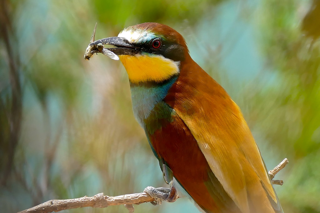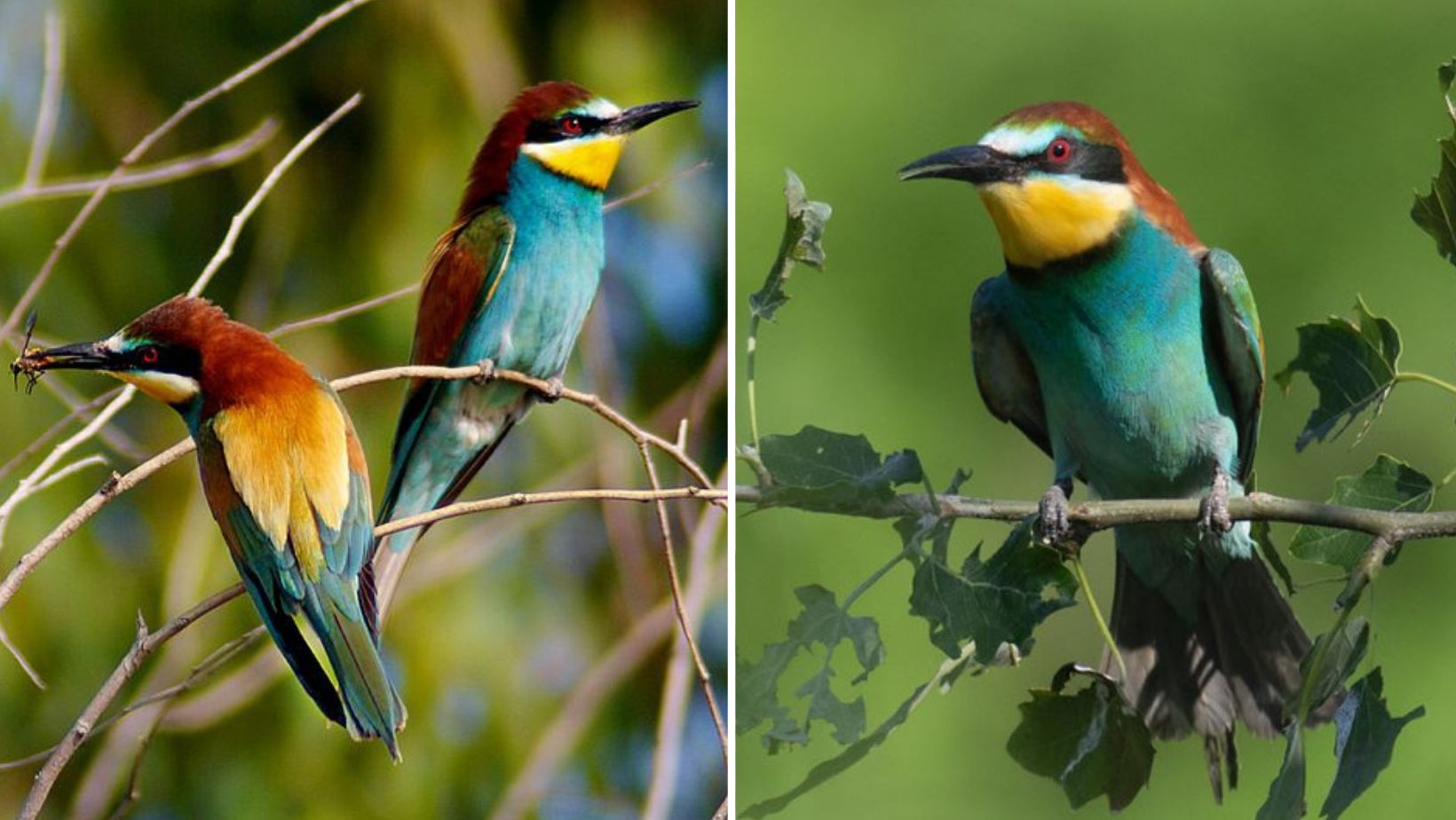 Spectacularly colorful, this starling-sized bird wears a bright yellow throat, gem-like belly, and a flaming red back – Meet the european bee-eater.