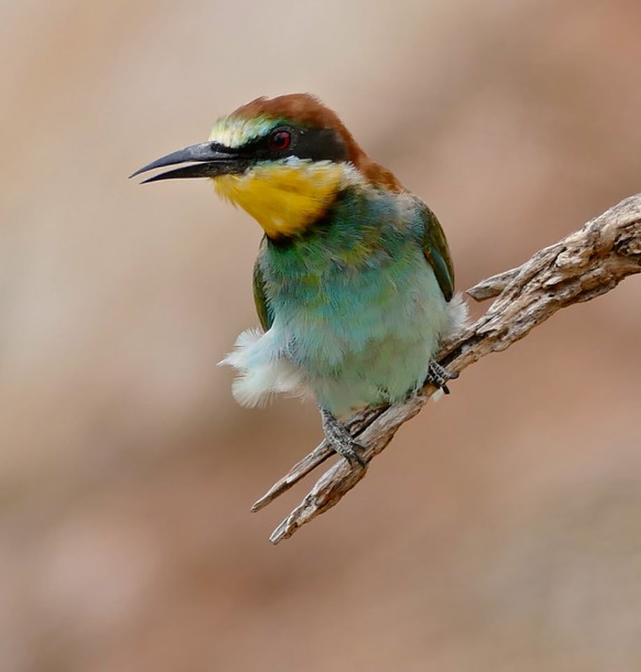 The European bee-eater (Merops apiaster) is easily recognized due to its strikingly colorful plumage. This plumage is especially striking during the breeding season when the head is topped off by a brown cap and bright yellow forehead. There is a black eye band starting from the base of the bill which extends below the eye almost to the nape of the neck. Below the bill is a bright patch of yellow boarded by a black band, below which is green-blue extending all the way down to the tail. The tail itself has a central spike caused by two elongated feathers which are easier to see during flight.