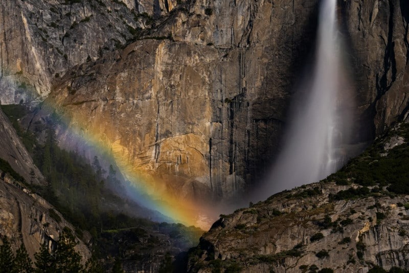 Although it was not a planned event, Harlow had spent over three months in Yosemite last year and was lucky enough to witness this phenomenon. He was attempting to take a photo of Yosemite Falls from Glacier Point when suddenly the waterfall transformed into a rainbow, a rare occurrence that only happens at certain times of the year and under specific circumstances.