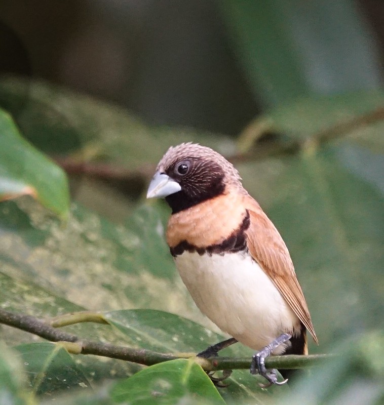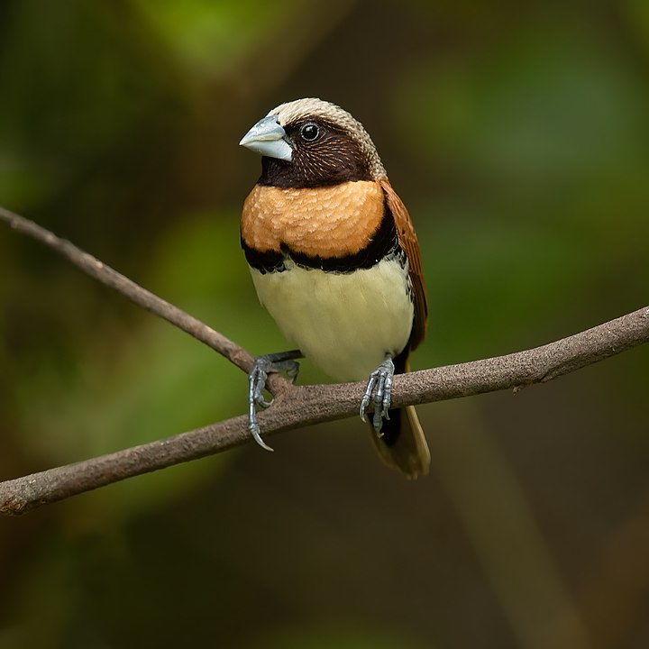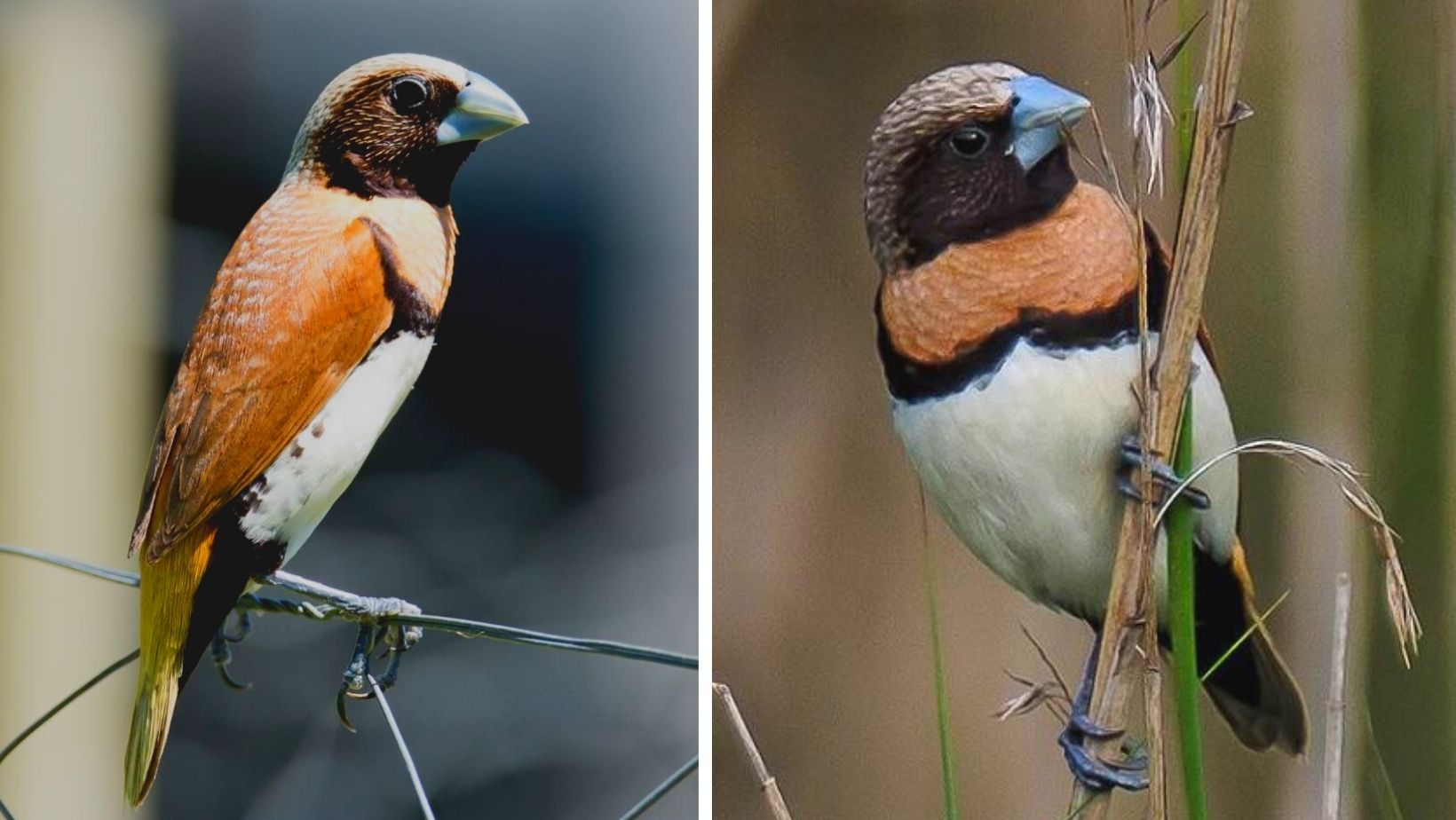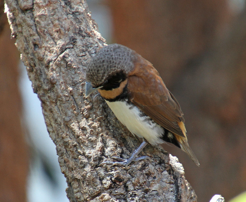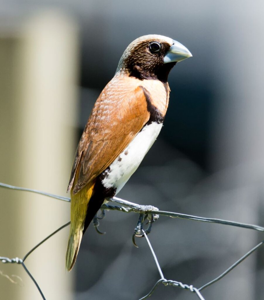 The chestnut-breasted mannikin (Lonchura castaneothorax), also known as the chestnut-breasted munia or bully bird. A small brown-backed bird with a black face, heavy bill, and greyish crown and nape. The crown is grey, the breast is chestnut, divided from white underparts by a black bar. The rump and tail are a shade of golden orange, with a black undertail.