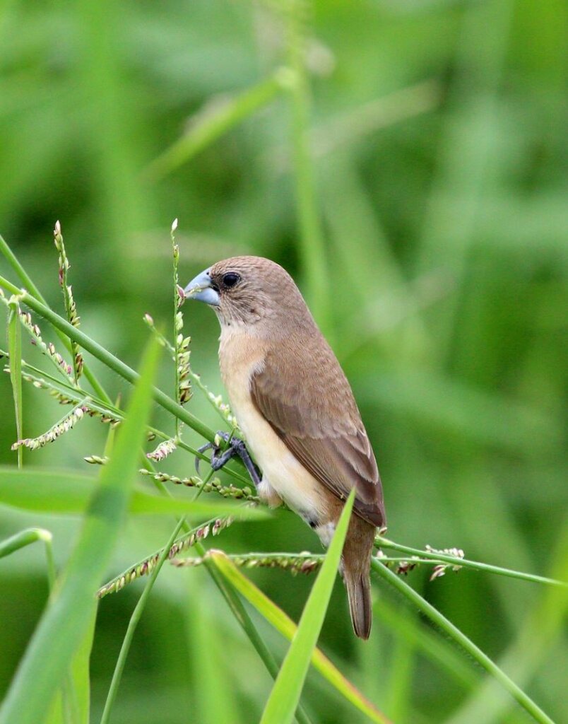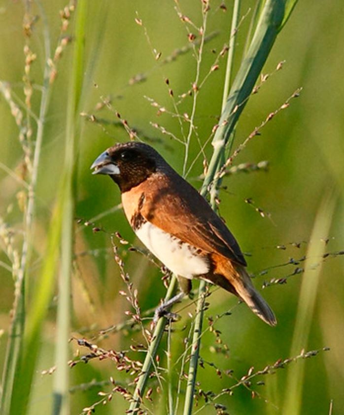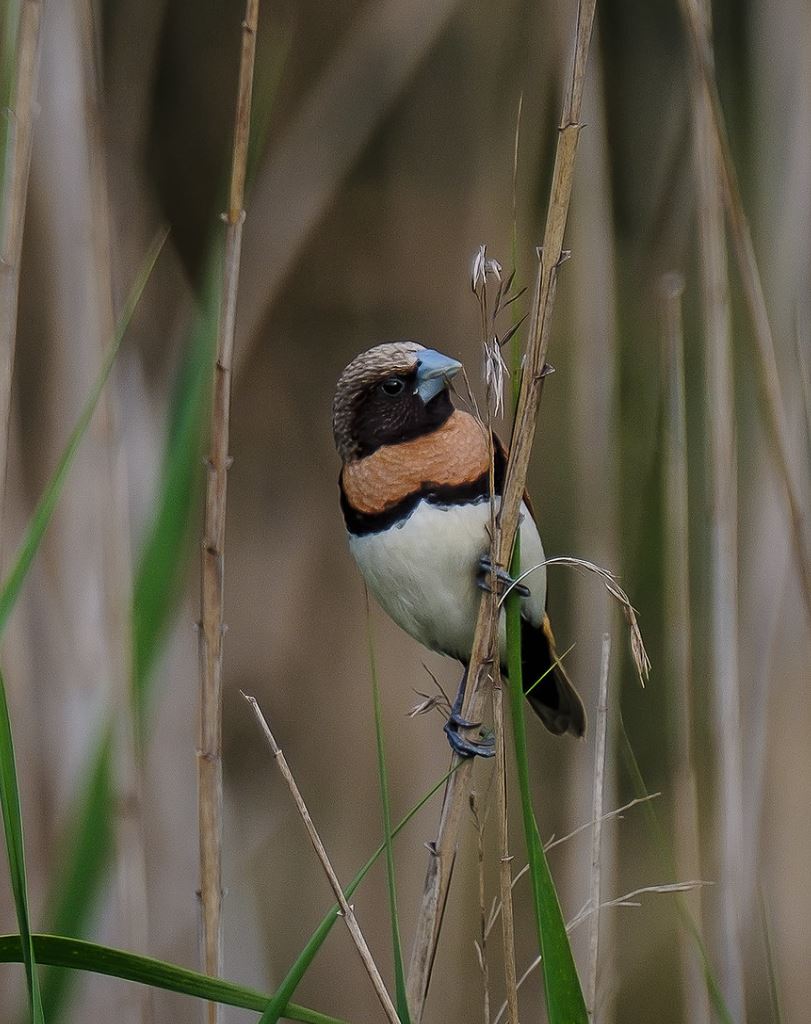 The Chestnut-breasted mannikin is a bird who likes to frequent reed beds and rank grasses bordering rivers, swamps, grassy country, and mangroves. It also likes cane fields and cereal crops. In dry seasons, it is seen in arid country, but always near water.