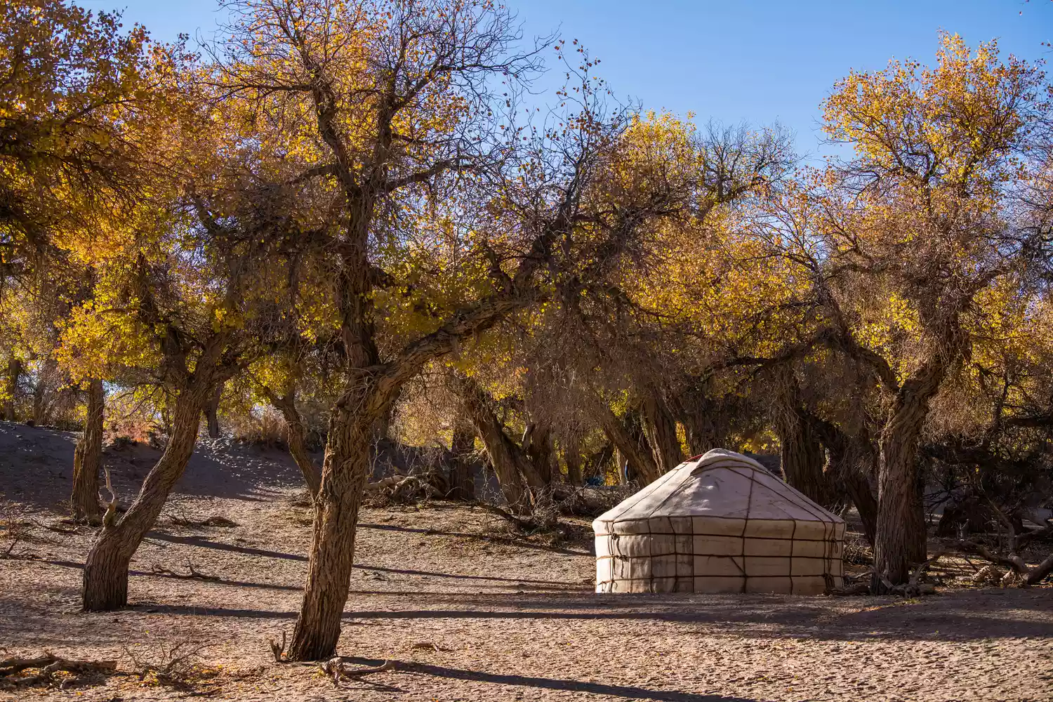 In the Badain Jaran Desert in the Inner Mongolia province of China, enormous sand dunes sing and whistle in the wind, while dozens of spring-fed lakes between the dunes support animals, plants, and brave tourists. Among the attractions are the leaves of the Populus euphratica tree, which turn golden in autumn. It is used as a shade plant in agroforestry and in afforestation efforts.