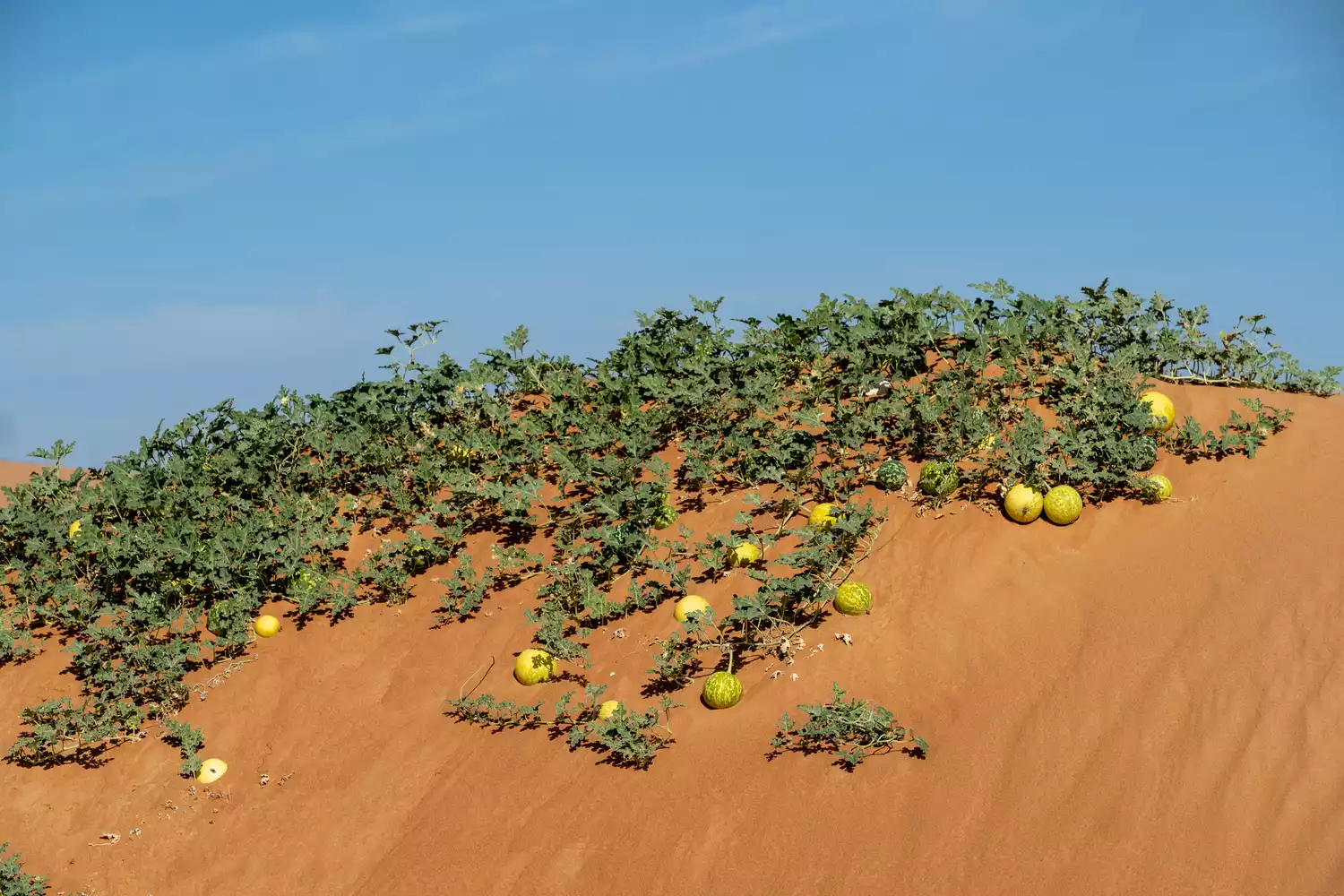 Also known as desert squash, Ьіtteг apple, vine of Sodom, and handhal, Citrullus colocynthis grows on the sand dunes of the Saharan and Arabian deserts. Looking like a watermelon but with a very Ьіtteг pulp, its seeds and flowers are edible. Water absorbed in the stem provides a welcome desert drink.
